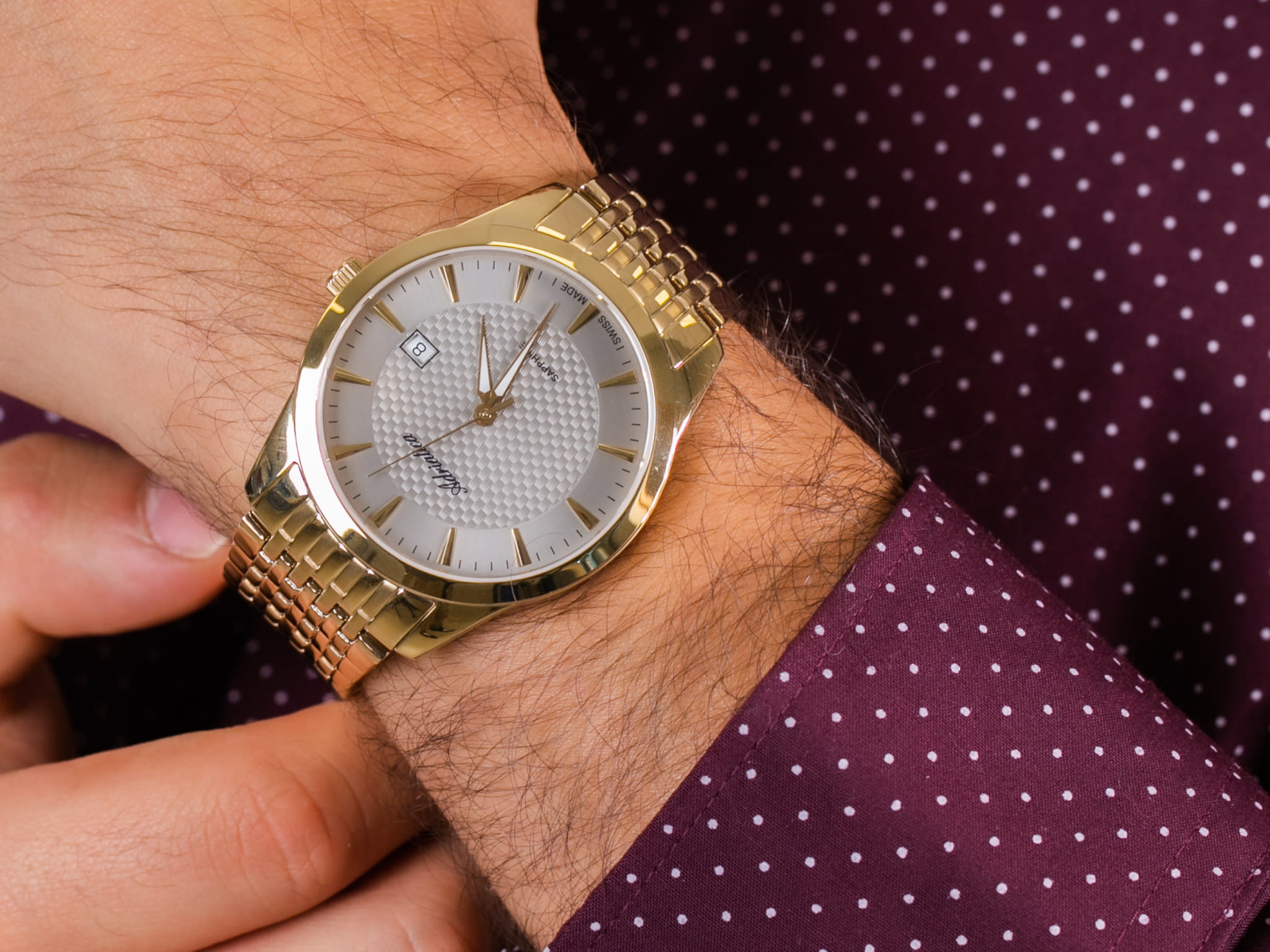 Мужские часы с сапфировым стеклом Adriatica Premiere A1288.1117Q, кварцевый механизм с высокой точностью. Сапфировое стекло устойчивое к появлению царапин, обладающее высокой прозрачностью. Класс водозащиты: 50 метров, позволит защитить корпус от случайных брызг или капель дождя. Корпус часов изготовлен из стали, позолоченного цвета.