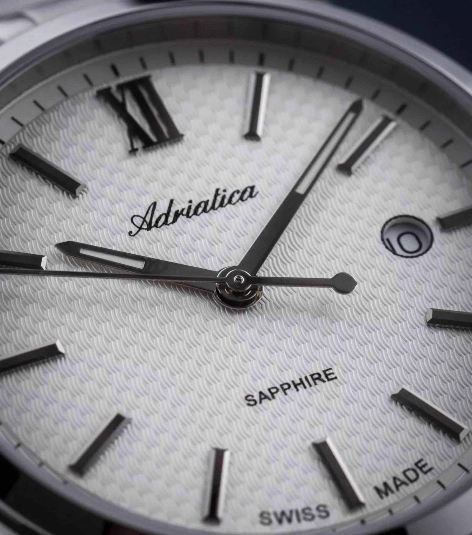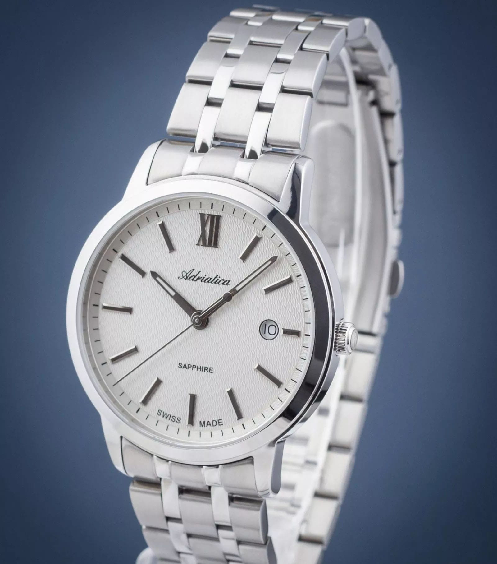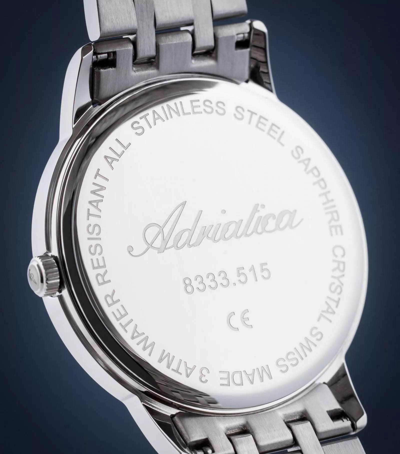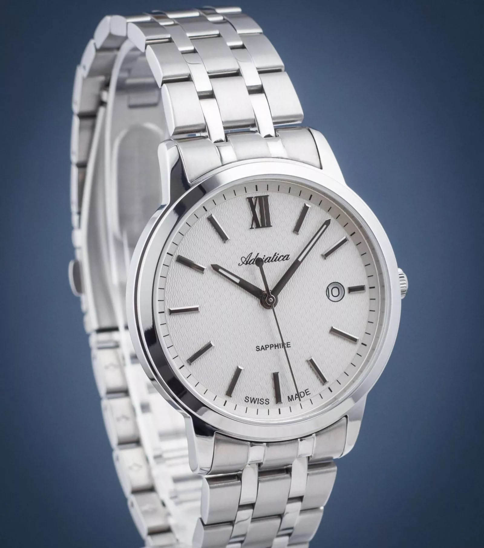 Мужские швейцарские кварцевые часы Adriatica A8333.5163Q, кварцевый механизм с высокой точностью. Сапфировое стеклоСапфировое стеклоПрочный и надёжный материал из кристалла сапфира синтетического происхождения, характеризующийся особой твёрдостью и устойчивостью к царапинам и повреждениям. устойчивое к появлению царапин, обладающее высокой прозрачностью. Класс водозащиты: 30 метров, позволит защитить корпус от случайных брызг или капель дождя. Корпус часов изготовлен из стали. Стальной браслет на раскладной застёжкеРаскладная застёжкаТакой тип застёжки используется только на браслетах из металла. Она никогда не раскрывается полностью, происходит разделение на 2 и более частей. Раскладывающая застёжка снизит вероятность потери часов к минимуму.. Стрелки с люминесцентным покрытиемЛюминесцентное покрытиеПозволяет считывать показания времени в темноте. Производители наносят на стрелки, часовые индексы, безель или поверхность циферблата светонакопительный состав, дающий холодное свечение.. Окошко даты находится в положении 3 часа.