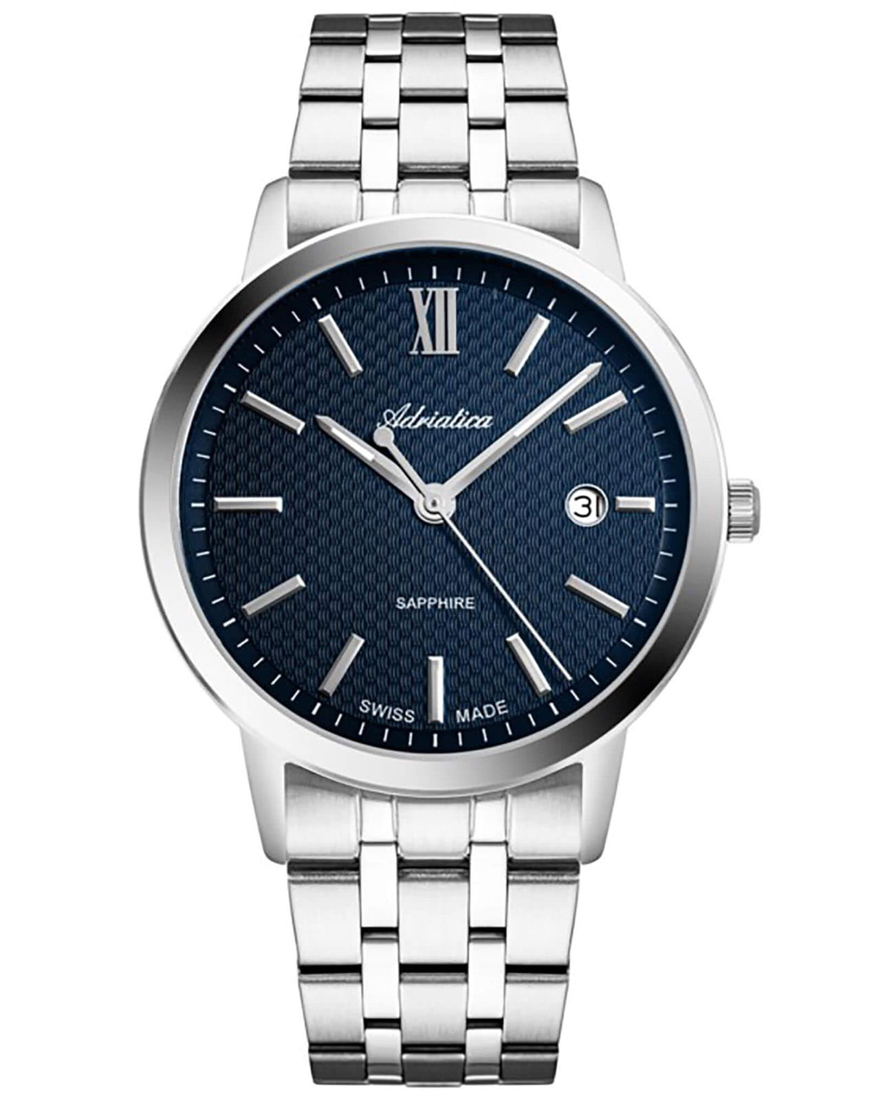 Мужские швейцарские кварцевые часы Adriatica A8333.5165Q, кварцевый механизм с высокой точностью. Сапфировое стеклоСапфировое стеклоПрочный и надёжный материал из кристалла сапфира синтетического происхождения, характеризующийся особой твёрдостью и устойчивостью к царапинам и повреждениям. устойчивое к появлению царапин, обладающее высокой прозрачностью. Класс водозащиты: 30 метров, позволит защитить корпус от случайных брызг или капель дождя. Корпус часов изготовлен из стали. Стальной браслет на раскладной застёжкеРаскладная застёжкаТакой тип застёжки используется только на браслетах из металла. Она никогда не раскрывается полностью, происходит разделение на 2 и более частей. Раскладывающая застёжка снизит вероятность потери часов к минимуму.. Стрелки с люминесцентным покрытиемЛюминесцентное покрытиеПозволяет считывать показания времени в темноте. Производители наносят на стрелки, часовые индексы, безель или поверхность циферблата светонакопительный состав, дающий холодное свечение.. Окошко даты находится в положении 3 часа.