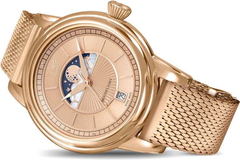 Aviator V.1.33.2.260.5 “Douglas Moonflight” — элегантный дамский швейцарский Moonphase-хронограф с утончённой авиационной эстетикой. Корпус 36 мм из нержавеющей стали с PVD-покрытиемPVDУльтратонкое покрытие наносится в технике вакуумного напыления, сочетает в себе нитрид титана особой прочности со слоем золота или оксида хрома. Несёт в себе декоративную или защитную функцию. с полированной отделкой обладает компактными пропорциями и удобным литым профилем.