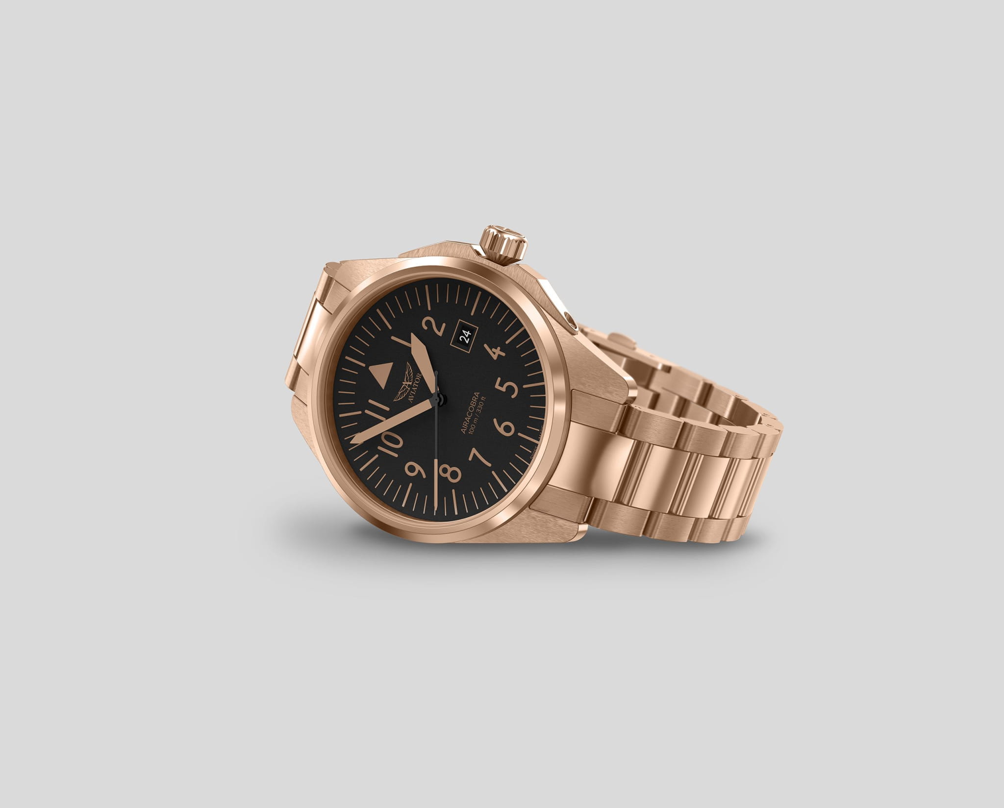 Aviator Airacobra 43 Type A V.1.38.2.316.5 — надёжные швейцарские пилотские часы с насыщенным функционалом и строгим авиационным дизайном. Корпус диаметром 42,8 мм выполнен из нержавеющей стали 316L с PVD-покрытиемPVDУльтратонкое покрытие наносится в технике вакуумного напыления, сочетает в себе нитрид титана особой прочности со слоем золота или оксида хрома. Несёт в себе декоративную или защитную функцию.. Циферблат имеет крупные арабские цифры и жёсткий контраст, соответствующий классическим пилотским образцам. Стрелки и метки покрыты люминесцентным покрытиемЛюминесцентное покрытиеПозволяет считывать показания времени в темноте. Производители наносят на стрелки, часовые индексы, безель или поверхность циферблата светонакопительный состав, дающий холодное свечение. Superluminova — это обеспечивает отличную читаемость в любых условиях. Окошко даты расположено у отметки «3 часа». На борту установлен швейцарский кварцевый механизм, способный с высокой точностью отображать время, дату. В механизме 4 камня. Циферблат защищён стойким сапфировым стекломСапфировое стеклоПрочный и надёжный материал из кристалла сапфира синтетического происхождения, характеризующийся особой твёрдостью и устойчивостью к царапинам и повреждениям. с антибликовым покрытиемАнтибликовое покрытиеСлой оксида металла в 0,13-0,3 микрон, благодаря которому стекло часов не бликует и не отражает свет. Антибликовое покрытие уменьшает отражение света в 10 раз, обеспечивая отличную читаемость показателей циферблата., завинчивающаяся заводная головка и задняя крышка обеспечивают уровень водозащиты до 100 метров. Стальной браслет с PVD-покрытиемPVDУльтратонкое покрытие наносится в технике вакуумного напыления, сочетает в себе нитрид титана особой прочности со слоем золота или оксида хрома. Несёт в себе декоративную или защитную функцию. с раскладной застёжкойРаскладная застёжкаТакой тип застёжки используется только на браслетах из металла. Она никогда не раскрывается полностью, происходит разделение на 2 и более частей. Раскладывающая застёжка снизит вероятность потери часов к минимуму. обеспечивает удобство и надёжную фиксацию. Airacobra 43 Type A — инструментальные пилотские часы для тех, кто ценит надёжность, точность и удобную функциональность второго часового пояса в эстетике классических авиационных хронометров. Лимитированная серия.