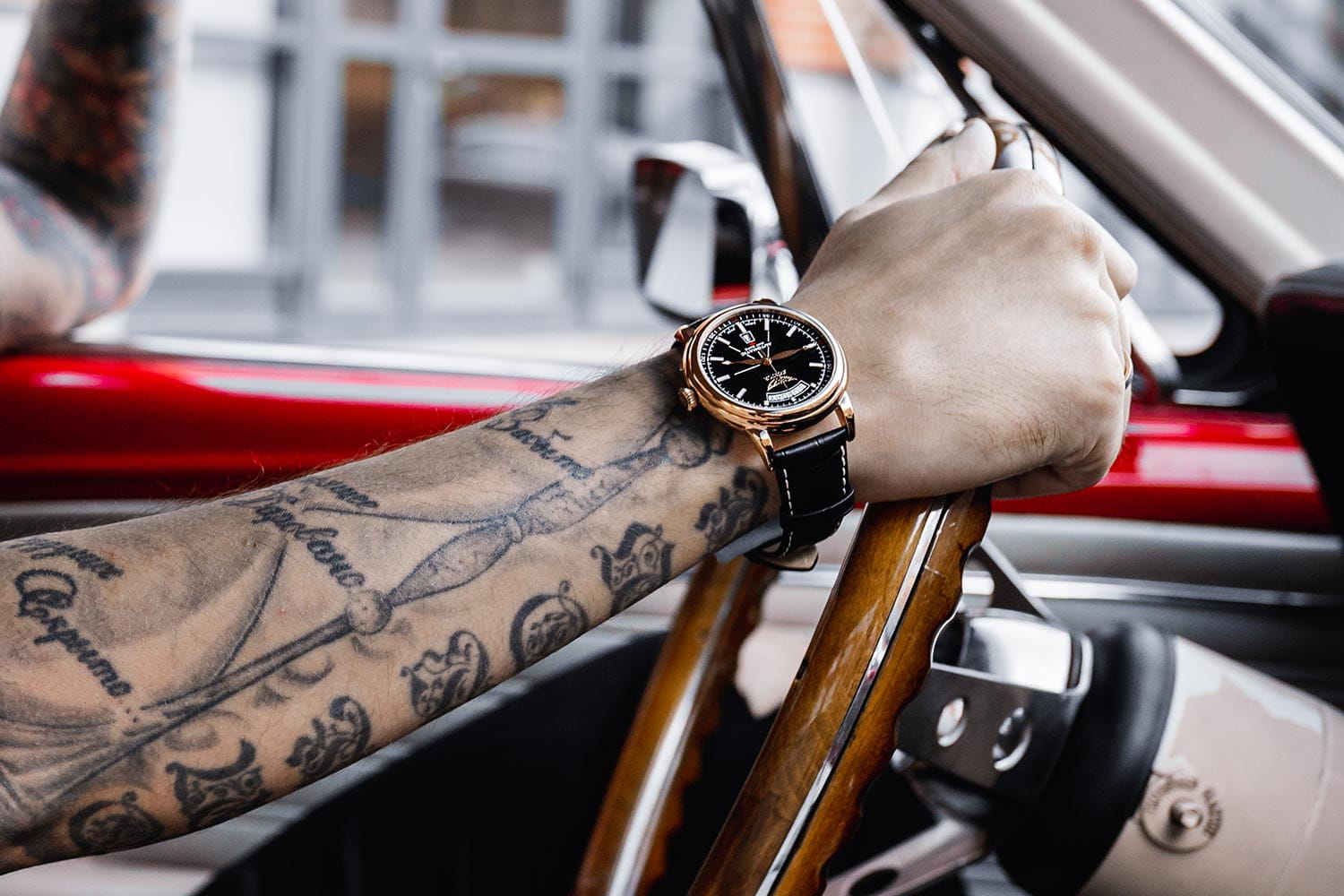Циферблат с сатинированной отделкой оформлен в духе Art Deco. В верхней части — изогнутое окошко дня недели, в нижней — классический индикатор даты. Крупные арабские цифры, минутная шкала и стрелки типа «ланцет» обеспечивают превосходную читаемость. Для удобства в условиях слабого освещения стрелки и метки покрыты люминесцентным покрытиемЛюминесцентное покрытиеПозволяет считывать показания времени в темноте. Производители наносят на стрелки, часовые индексы, безель или поверхность циферблата светонакопительный состав, дающий холодное свечение..