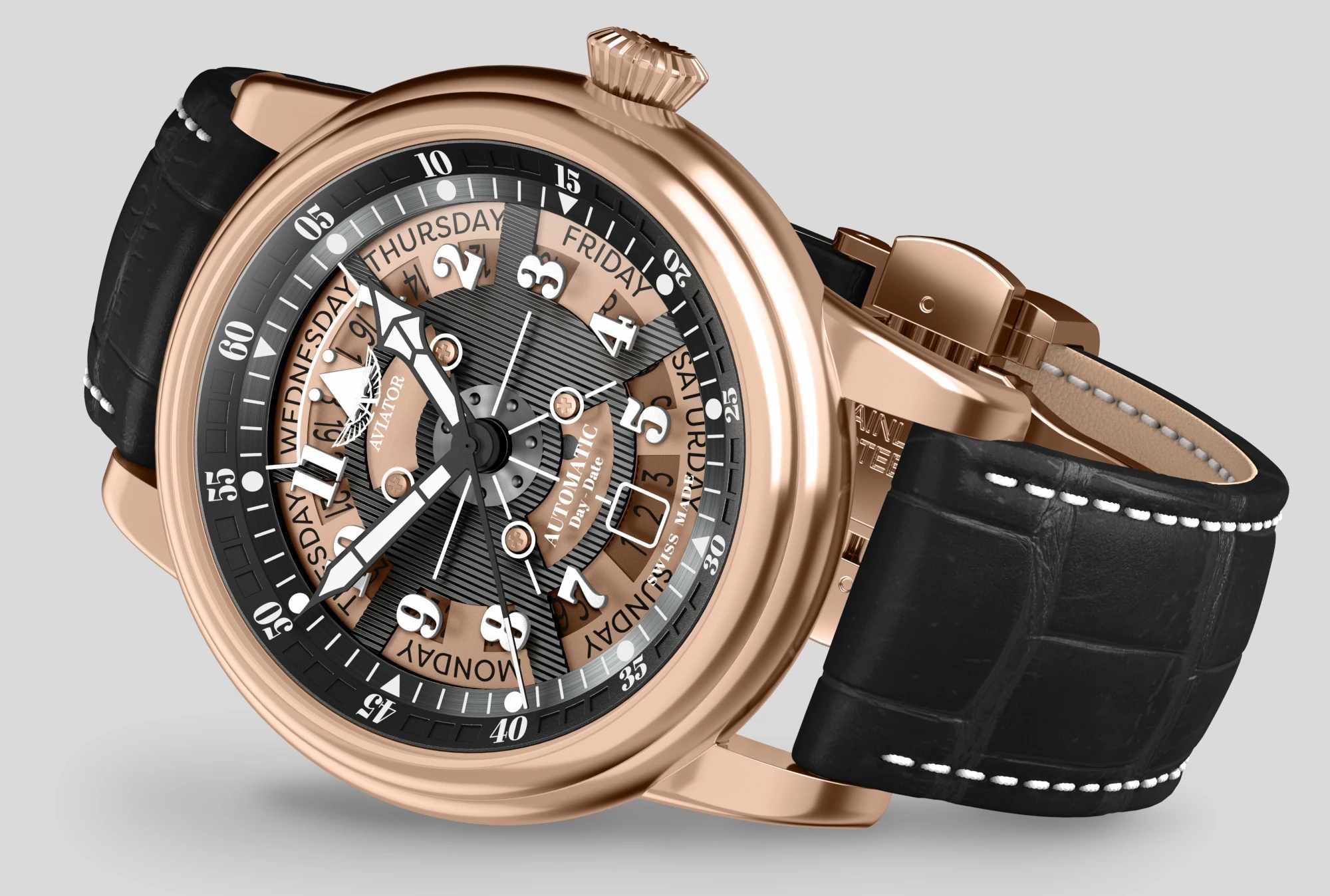 Aviator Douglas Day Date V.3.36.2.289.4 — швейцарские часы в классике авиадизайна, сочетающие безупречную читаемость и высокую надёжность. Лимитированная серия. Корпус диаметром 41 мм выполнен из нержавеющей стали 316L с PVD-покрытиемPVDУльтратонкое покрытие наносится в технике вакуумного напыления, сочетает в себе нитрид титана особой прочности со слоем золота или оксида хрома. Несёт в себе декоративную или защитную функцию. цвета розового золота. Накладные метки выполнены в виде арабских цифр. Окошко даты находится в положении 6 часов. День недели находится в положении 12 часов. Часовые метки и стрелки покрыты люминесцентным покрытиемЛюминесцентное покрытиеПозволяет считывать показания времени в темноте. Производители наносят на стрелки, часовые индексы, безель или поверхность циферблата светонакопительный состав, дающий холодное свечение. Superluminova, позволяющим легко определять время даже в тёмное время суток. Поверхность защищена прочным сапфировым стекломСапфировое стеклоПрочный и надёжный материал из кристалла сапфира синтетического происхождения, характеризующийся особой твёрдостью и устойчивостью к царапинам и повреждениям. с антибликовым покрытием, устойчивым к царапинам. Сердце модели — швейцарский механизм Sellita SW 240-2, известный своей точностью и долговечностью. Водозащита 100 метров, позволит плавать, нырять и заниматься другими водными видами спорта. Завинчивающаяся головка и задняя крышка обеспечивают уверенную ударопрочностьУдаропрочный корпусМеханизм заключён в корпус, выполненный из современных материалов, устойчивых к ударам, механическим повреждениям и падению с высоты: инновационный пластик, карбон, нержавеющая сталь, титан. и надёжную защиту от влаги и пыли. В механизме 26 камней, запас хода до 41 час. Модель дополнена кожаным ремешком с выразительной текстурой и классическим стилем, закреплённым с помощью застёжке-бабочке с кнопкамиЗастёжка "бабочка"Такой вид застёжки дополняется предохранителями, помогающими избежать случайного раскрытия браслета. Обладают изящным исполнением. — для максимального комфорта и лёгкости в повседневном использовании. Ротор механизма с заклепанными элементами и вырезанными окнами напоминает фюзеляж самолета. Aviator — это образец лётной точности, инженерной чёткости и сдержанной роскоши, идеально подходящий для тех, кто ценит функциональность и уверенность в каждом элементе.
