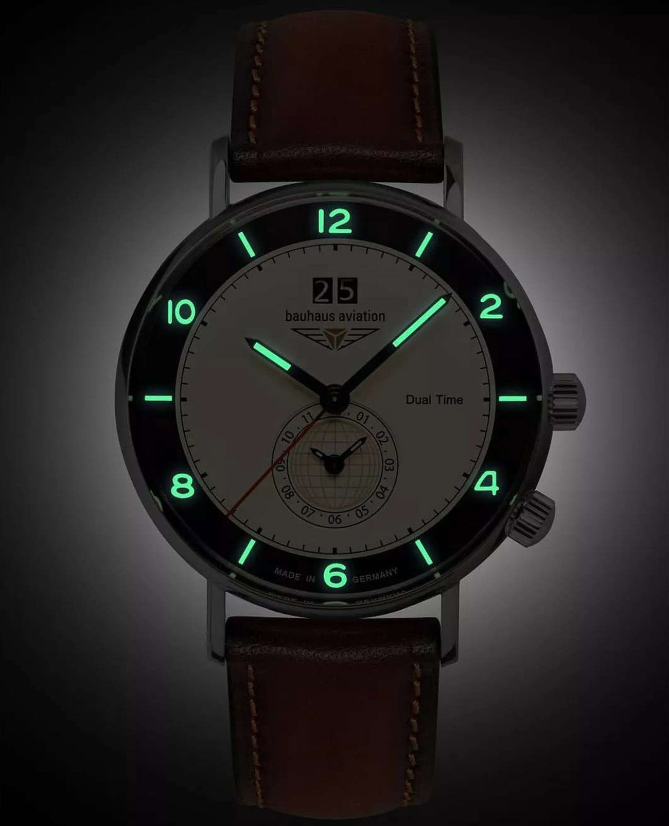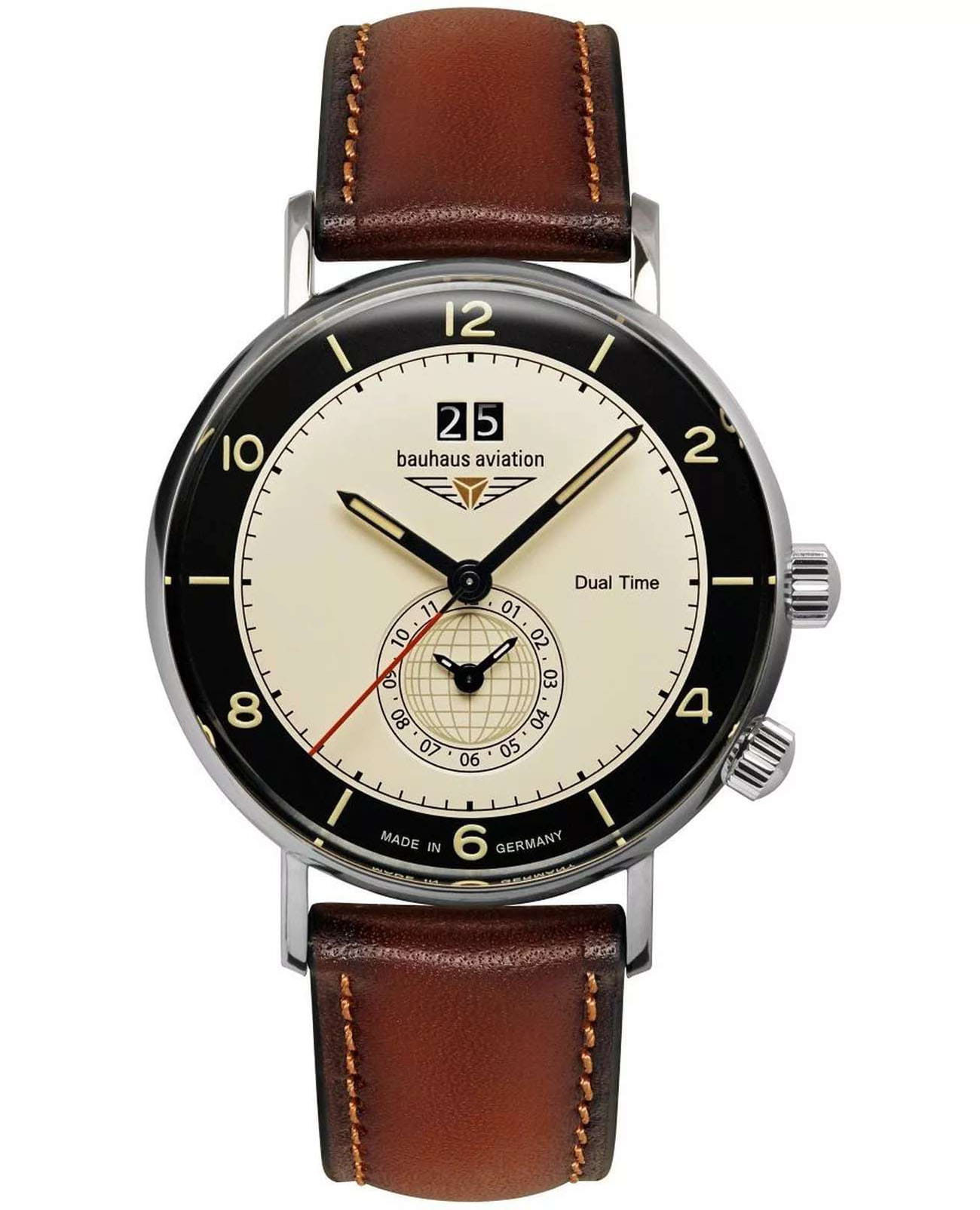 Мужские кварцевые часы Bauhaus — это аксессуар с винтажным пилотским стилем. Корпус диаметром 41 мм и толщиной 11 мм выполнен из нержавеющей стали. Циферблат бежевого цвета оформлен арабскими цифрами и стрелками. Окошко даты расположено в положении 12 часов, также присутствует индикация второго часового пояса. Стрелки и метки с люминесцентным покрытиемЛюминесцентное покрытиеПозволяет считывать показания времени в темноте. Производители наносят на стрелки, часовые индексы, безель или поверхность циферблата светонакопительный состав, дающий холодное свечение., обеспечивающим хорошую читаемость в темноте. Циферблат защищён прочным минеральным стекломМинеральное стеклоМинеральное стекло представляет собой искусственно выращенный минерал кварца. Такое стекло отличается особой устойчивостью к повреждениям и царапинам. Уступает по некоторым качествам сапфировому стеклу. K1. Механизм — швейцарский кварцевый. Часы оснащены коричневым кожаным ремешком на классической пряжке. Водонепроницаемость 50 м позволяет использовать часы в повседневных условиях. Идеальный выбор для тех, кто ценит немецкое качество и ретро-стиль.