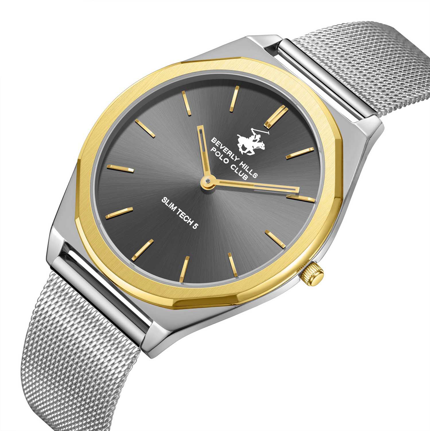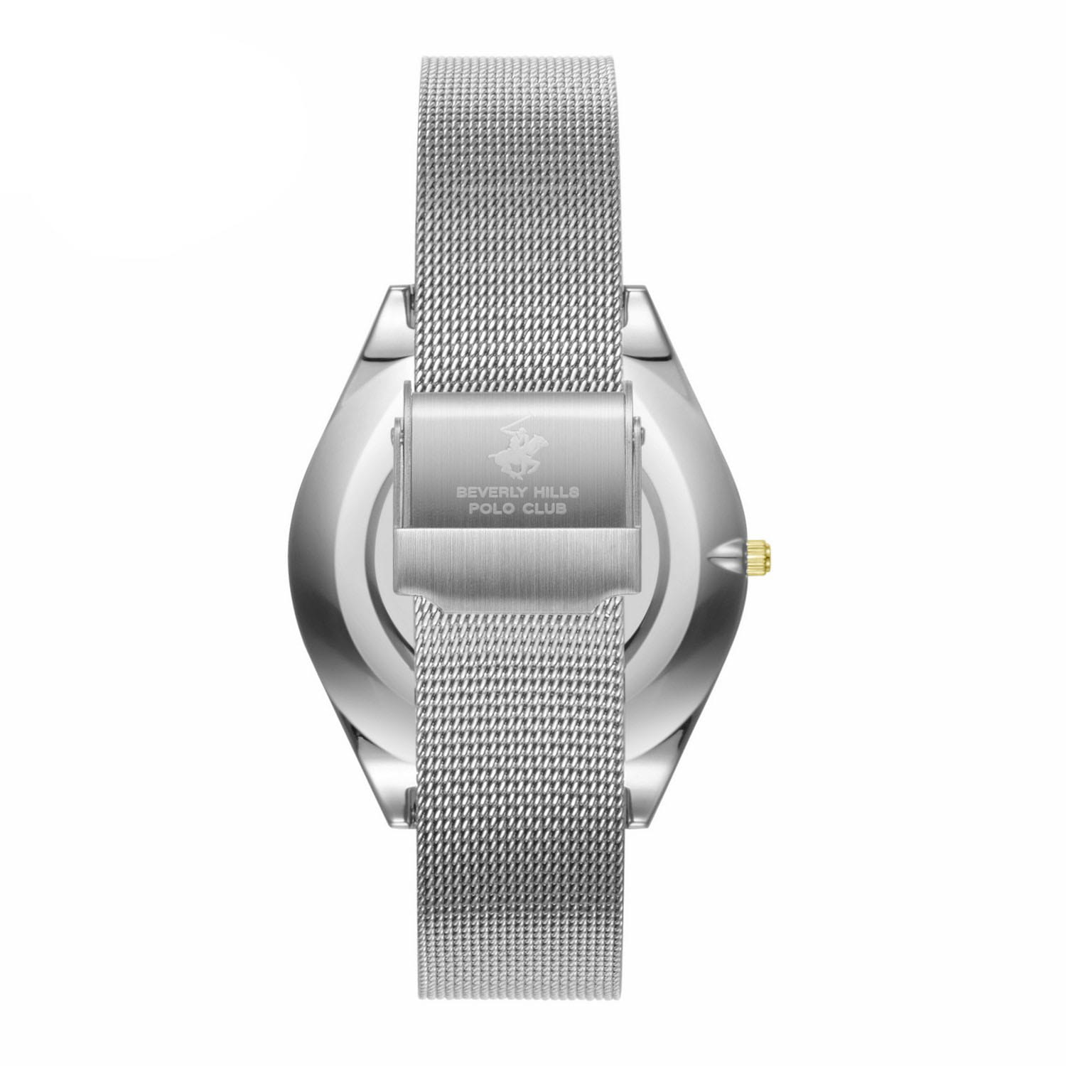 Американские часы Beverly Hills Polo Club BP3710X.260, кварцевый механизм с высокой точностью. Класс водозащиты: 50 метров, позволит защитить корпус от случайных брызг или капель дождя. Корпус часов изготовлен из нержавеющей стали. Стальной браслет миланского плетения на раскладном замкеРаскладной замокДанный вариант застежки используется только на часах с металлическим браслетом. Отличительная особенность такого крепления в том, что длина браслета становится универсальной и вы можете самостоятельно отрегулировать нужный вам размер – застежка просто двигается по браслету часов.. Минеральное стеклоМинеральное стеклоМинеральное стекло представляет собой искусственно выращенный минерал кварца. Такое стекло отличается особой устойчивостью к повреждениям и царапинам. Уступает по некоторым качествам сапфировому стеклу. устойчивое к мелким механическим повреждениям. Неподвижный безельБезельВнешний ободок, закрепляющий стекло. В спортивных часах так называется поворотное кольцо с делениями на циферблате, выполняет роль таймера – замеряет отрезки времени на шкале. Неподвижный безель – элемент декора. Однонаправленно вращающийся безель на дайверских часах позволяет фиксировать моменты погружения и выныривания на поверхность. из нержавеющей стали с IP-покрытиемIP-покрытиеМетод ионного напыления. Демонстрирует повышенную устойчивость к истиранию, окислению и химическим веществам. Под воздействием высокого давления и температуры около 1500°C молекулы металла надёжно соединяются с частицами корпуса часов..