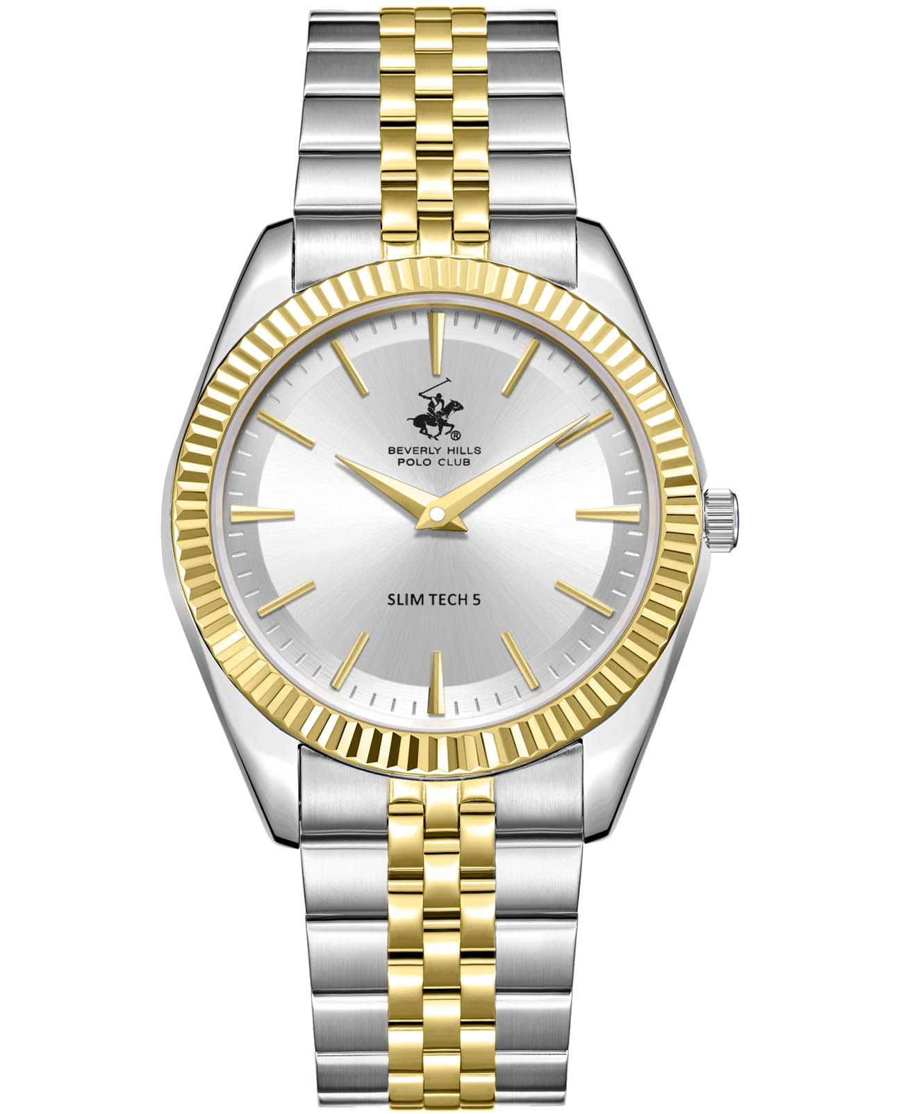 BEVERLY HILLS POLO CLUB BP3830X.230 — стильные мужские часы, сочетающие спортивную динамику и функциональность. Крупный корпус выполнен из нержавеющей стали серебристого цвета, диаметром 39 мм, гармонично дополнен стальным браслетом с частичным IP-покрытиемIP-покрытиеМетод ионного напыления. Демонстрирует повышенную устойчивость к истиранию, окислению и химическим веществам. Под воздействием высокого давления и температуры около 1500°C молекулы металла надёжно соединяются с частицами корпуса часов. на застёжке-бабочке с кнопкамиЗастёжка "бабочка"Такой вид застёжки дополняется предохранителями, помогающими избежать случайного раскрытия браслета. Обладают изящным исполнением. . Циферблат с акцентными стрелками и метками, что делает модель более практичной. Минеральное стеклоМинеральное стеклоМинеральное стекло представляет собой искусственно выращенный минерал кварца. Такое стекло отличается особой устойчивостью к повреждениям и царапинам. Уступает по некоторым качествам сапфировому стеклу. с сапфировым покрытием защищает циферблат от царапин, а кварцевый механизм обеспечивает высокую точность. Неподвижный рифленый безельБезельВнешний ободок, закрепляющий стекло. В спортивных часах так называется поворотное кольцо с делениями на циферблате, выполняет роль таймера – замеряет отрезки времени на шкале. Неподвижный безель – элемент декора. Однонаправленно вращающийся безель на дайверских часах позволяет фиксировать моменты погружения и выныривания на поверхность. с IP-покрытиемIP-покрытиеМетод ионного напыления. Демонстрирует повышенную устойчивость к истиранию, окислению и химическим веществам. Под воздействием высокого давления и температуры около 1500°C молекулы металла надёжно соединяются с частицами корпуса часов. золотистого цвета. Благодаря своей универсальной эстетике эти часы уместны и в деловой среде, и в повседневном образе. Идеальный выбор для тех, кто ценит элегантный дизайн и качество. Водозащита до 50 метров позволит защитить корпус от случайных брызг или капель дождя.