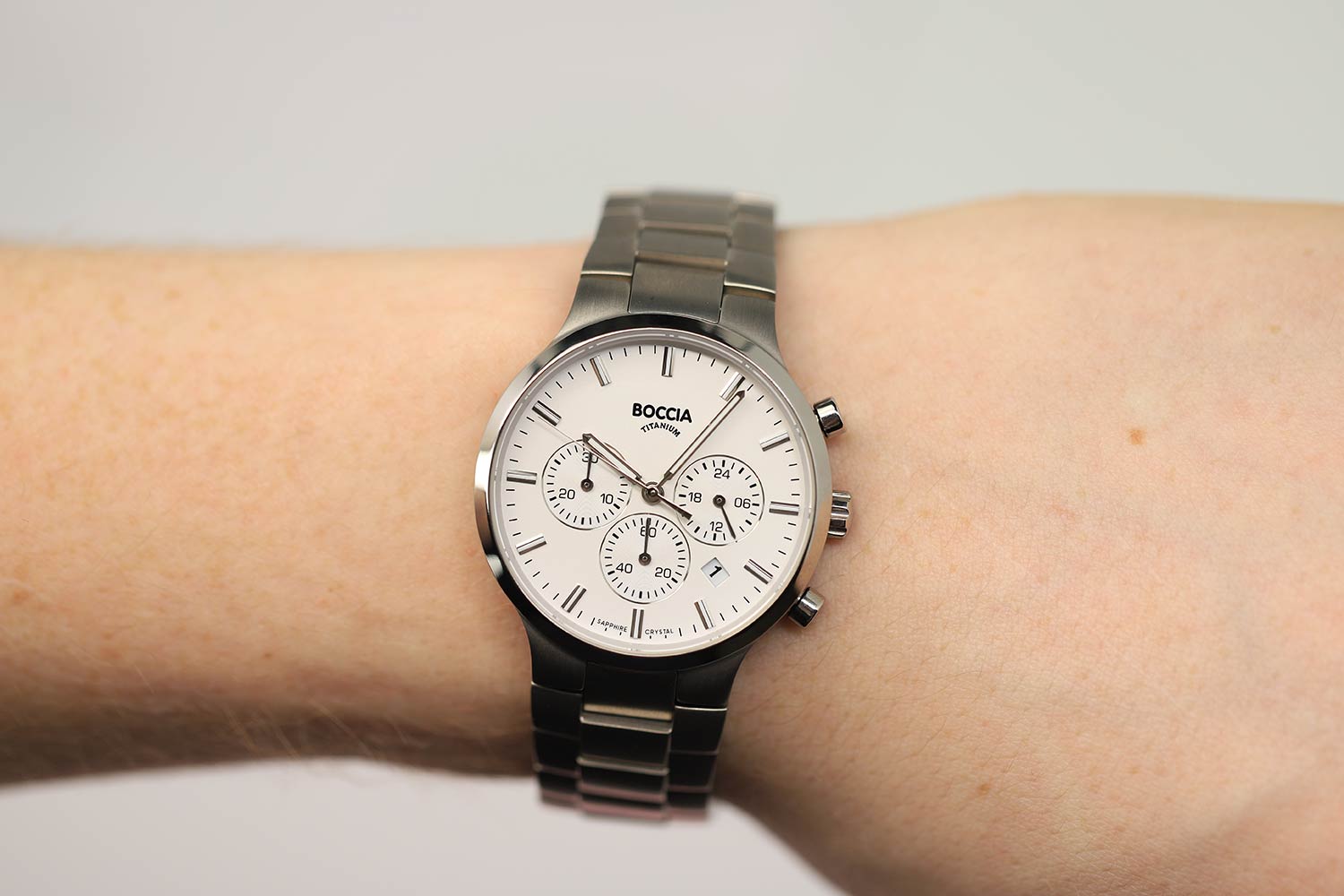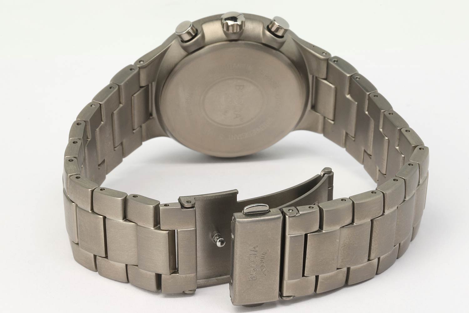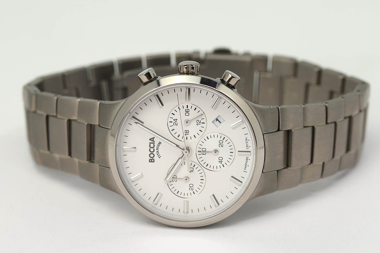 Мужские наручные часы-хронографХронографФункция позволяет измерять отрезки времени с особой точностью: часы, минуты, секунды. Верным признаком хронографа является наличие на циферблате 3 дополнительных окошек-счётчиков. Boccia Titanium 3746-01 с надёжным кварцевым механизмом. Корпус и браслет часов изготовлены из титана. Сапфировое стеклоСапфировое стеклоПрочный и надёжный материал из кристалла сапфира синтетического происхождения, характеризующийся особой твёрдостью и устойчивостью к царапинам и повреждениям. устойчивое к мелким механическим повреждениям. Класс водозащиты: 50 метров, позволит защитить корпус от случайных брызг или капель дождя. Титановый браслет на раскладной застёжкеРаскладная застёжкаТакой тип застёжки используется только на браслетах из металла. Она никогда не раскрывается полностью, происходит разделение на 2 и более частей. Раскладывающая застёжка снизит вероятность потери часов к минимуму.. Окошко даты находится между 4 и 5 часов. Стрелки и метки с люминесцентным покрытиемЛюминесцентное покрытиеПозволяет считывать показания времени в темноте. Производители наносят на стрелки, часовые индексы, безель или поверхность циферблата светонакопительный состав, дающий холодное свечение..