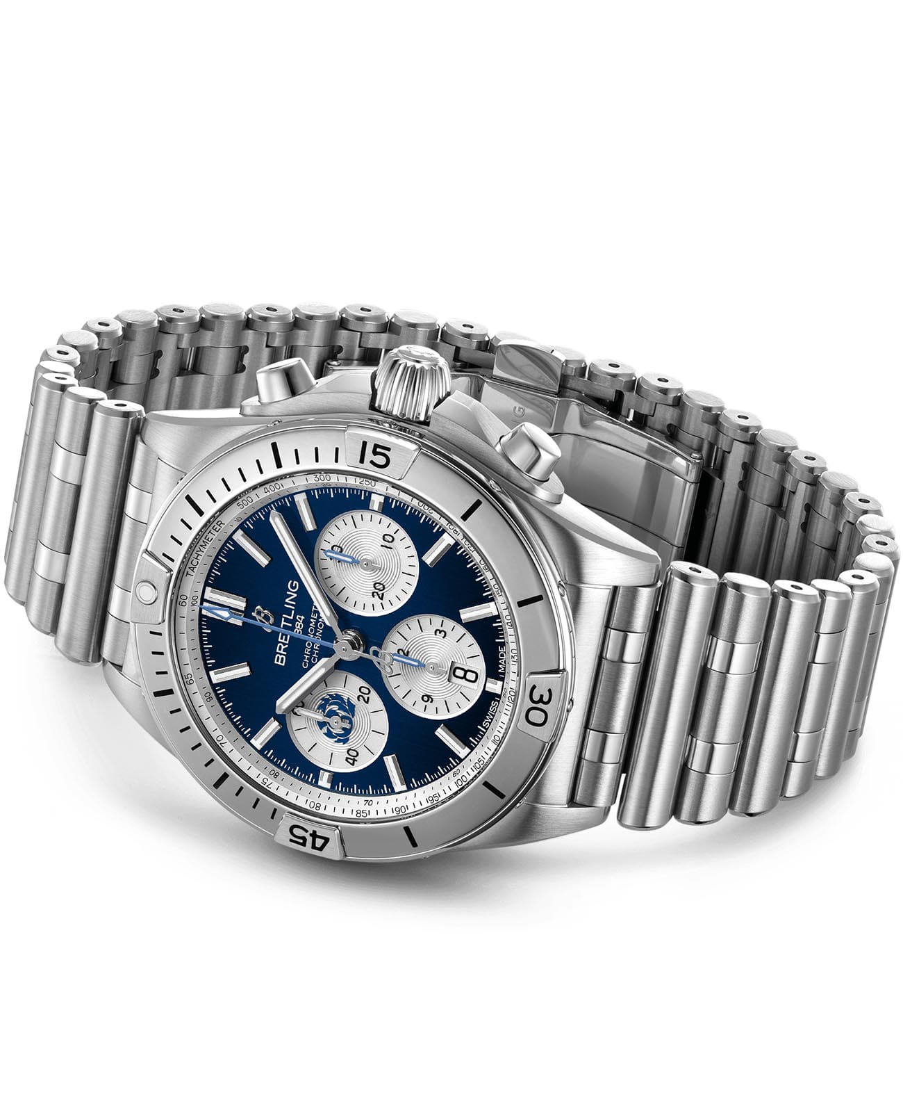 Лимитированные мужские швейцарские часы-хронографХронографФункция позволяет измерять отрезки времени с особой точностью: часы, минуты, секунды. Верным признаком хронографа является наличие на циферблате 3 дополнительных окошек-счётчиков. с секундомеромСекундомерСекундоме́р — прибор, способный измерять интервалы времени с точностью до долей секунды. Breitling Chronomat B01 42 AB0134A51C1A1, механический механизм (автоматический калибр) с высокой точностью. Основанный на хронографе Frecce Tricolori, который был разработан и выпущен в 1983 году в сотрудничестве со знаменитой итальянской авиационной эскадрильей, Chronomat стильно отпраздновал столетие Breitling и ознаменовал возвращение механическому хронографу его законного места в бренде, который построил свою мировую репутацию на этих невероятных часах. Сапфировое стеклоСапфировое стеклоПрочный и надёжный материал из кристалла сапфира синтетического происхождения, характеризующийся особой твёрдостью и устойчивостью к царапинам и повреждениям. устойчивое к появлению царапин, обладающее высокой прозрачностью. Класс водозащиты: 200 метров, позволит плавать, нырять и заниматься другими водными видами спорта. Корпус и браслет часов изготовлены из нержавеющей стали. Часы имеют сертификат COSCСертификат COSCОфициальный сертификат, подтверждающий то, что часы ходят с особо высокой точностью. Для получения документа часы подвергаются тестовым испытаниям, разработанным швейцарским институтом тестирования хронометров COSC. Допустимая норма для механических часов -4/+6 секунд в день, для кварцевых моделей +/- 0,07 секунд в день.. Стрелки и метки с люминесцентным покрытиемЛюминесцентное покрытиеПозволяет считывать показания времени в темноте. Производители наносят на стрелки, часовые индексы, безель или поверхность циферблата светонакопительный состав, дающий холодное свечение.. Шкала тахиметраТахиметрРазмеченная шкала, располагается на ободке или безеле часов. Тахиметр позволяет рассчитать скорость на определённом участке пути, расстояние измеряется в километрах или милях. на циферблате. Окошко даты находится в положении 6 часов. Браслет с застёжкой-бабочкой с кнопкамиЗастёжка "бабочка"Такой вид застёжки дополняется предохранителями, помогающими избежать случайного раскрытия браслета. Обладают изящным исполнением. .