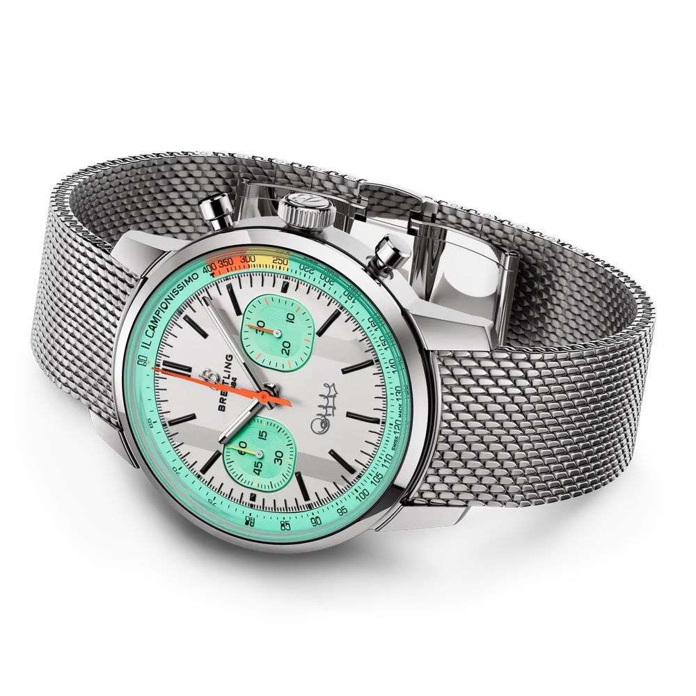 Breitling Top Time B01 Fausto Coppi AB01768A1A1A1 — лимитированные часы, вдохновлённые легендой велоспорта Фаусто Коппи и эстетикой ретро-хронографов 60-х годов. Корпус диаметром 41 мм выполнен из нержавеющей стали с комбинированной сатинированной и полированной отделкой. Прозрачная задняя крышка с гравировкой «Fausto Coppi Tribute» и «One of 750» подчёркивает уникальность выпуска. Циферблат защищён сапфировым стекломСапфировое стеклоПрочный и надёжный материал из кристалла сапфира синтетического происхождения, характеризующийся особой твёрдостью и устойчивостью к царапинам и повреждениям. с антибликовым покрытиемАнтибликовое покрытиеСлой оксида металла в 0,13-0,3 микрон, благодаря которому стекло часов не бликует и не отражает свет. Антибликовое покрытие уменьшает отражение света в 10 раз, обеспечивая отличную читаемость показателей циферблата.. Белый матовый циферблат украшен бирюзовыми субциферблатами и надписью «Il Campionissimo» по внешнему кругу. Подпись Fausto Coppi расположена на отметке 6 часов. Внутри установлен швейцарский автоматический калибр COSC-сертифицированныйСертификат COSCОфициальный сертификат, подтверждающий то, что часы ходят с особо высокой точностью. Для получения документа часы подвергаются тестовым испытаниям, разработанным швейцарским институтом тестирования хронометров COSC. Допустимая норма для механических часов -4/+6 секунд в день, для кварцевых моделей +/- 0,07 секунд в день. хронографХронографФункция позволяет измерять отрезки времени с особой точностью: часы, минуты, секунды. Верным признаком хронографа является наличие на циферблате 3 дополнительных окошек-счётчиков. Breitling B01, обеспечивающий точность, стабильность и запас хода до 70 часов. Модель укомплектована браслетом миланского плетения на застёжке «бабочка» с кнопкамиЗастёжка "бабочка"Такой вид застёжки дополняется предохранителями, помогающими избежать случайного раскрытия браслета. Обладают изящным исполнением. . Водонепроницаемость 100 метров делает часы надёжными не только в городе, но и в активной среде. Эта лимитированная модель — признание в любви к велоспорту и винтажной эстетике.