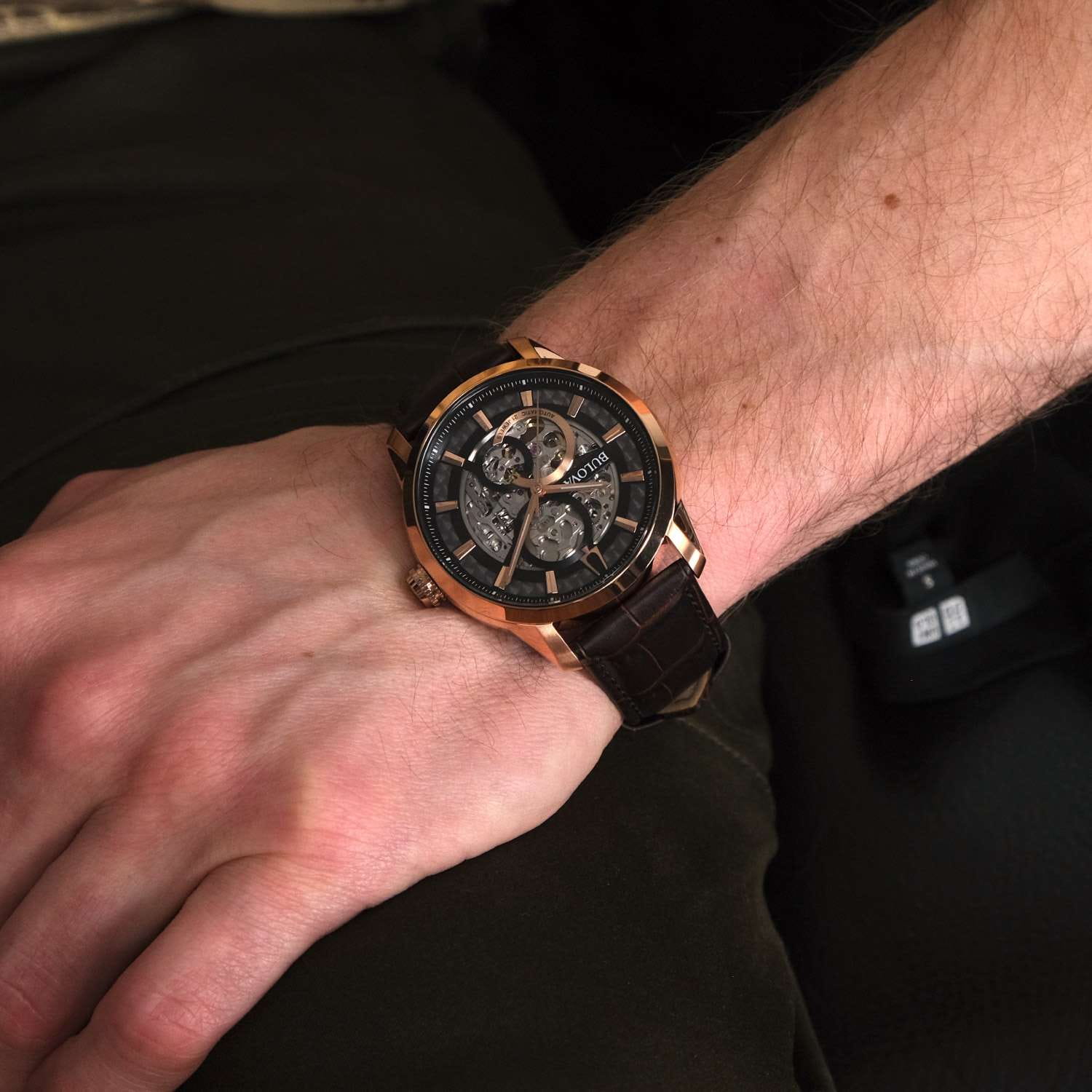 Мужские механические часы-скелетоны с автоподзаводом Bulova Sutton 97A169 – отражающий идеальное сочетание современного дизайна, надёжности и функциональности. Элегантный облик станет превосходным завершением образа, наделив его индивидуальным характером. Корпус из нержавеющей стали с IP-покрытиемIP-покрытиеМетод ионного напыления. Демонстрирует повышенную устойчивость к истиранию, окислению и химическим веществам. Под воздействием высокого давления и температуры около 1500°C молекулы металла надёжно соединяются с частицами корпуса часов. цвета розового золота, диаметром 43 мм идеально сбалансирован и элегантен. Минеральное стеклоМинеральное стеклоМинеральное стекло представляет собой искусственно выращенный минерал кварца. Такое стекло отличается особой устойчивостью к повреждениям и царапинам. Уступает по некоторым качествам сапфировому стеклу. защищает циферблат от царапин и устойчивое к мелким механическим повреждениям. Кожаный ремешок на застёжке-бабочке с кнопкамиЗастёжка "бабочка"Такой вид застёжки дополняется предохранителями, помогающими избежать случайного раскрытия браслета. Обладают изящным исполнением. обеспечивает комфортное ношение. Водозащита 30 метров позволит защитить корпус от случайных брызг или капель дождя. Стрелки с люминесцентным покрытиемЛюминесцентное покрытиеПозволяет считывать показания времени в темноте. Производители наносят на стрелки, часовые индексы, безель или поверхность циферблата светонакопительный состав, дающий холодное свечение. позволяющие легко определять время даже в темноте. Прозрачная задняя крышка. Эта модель – отличный выбор для тех, кто ищет сочетание стиля, качества и функциональности. Часы станут не только полезным аксессуаром, но и выразительным элементом вашего имиджа.