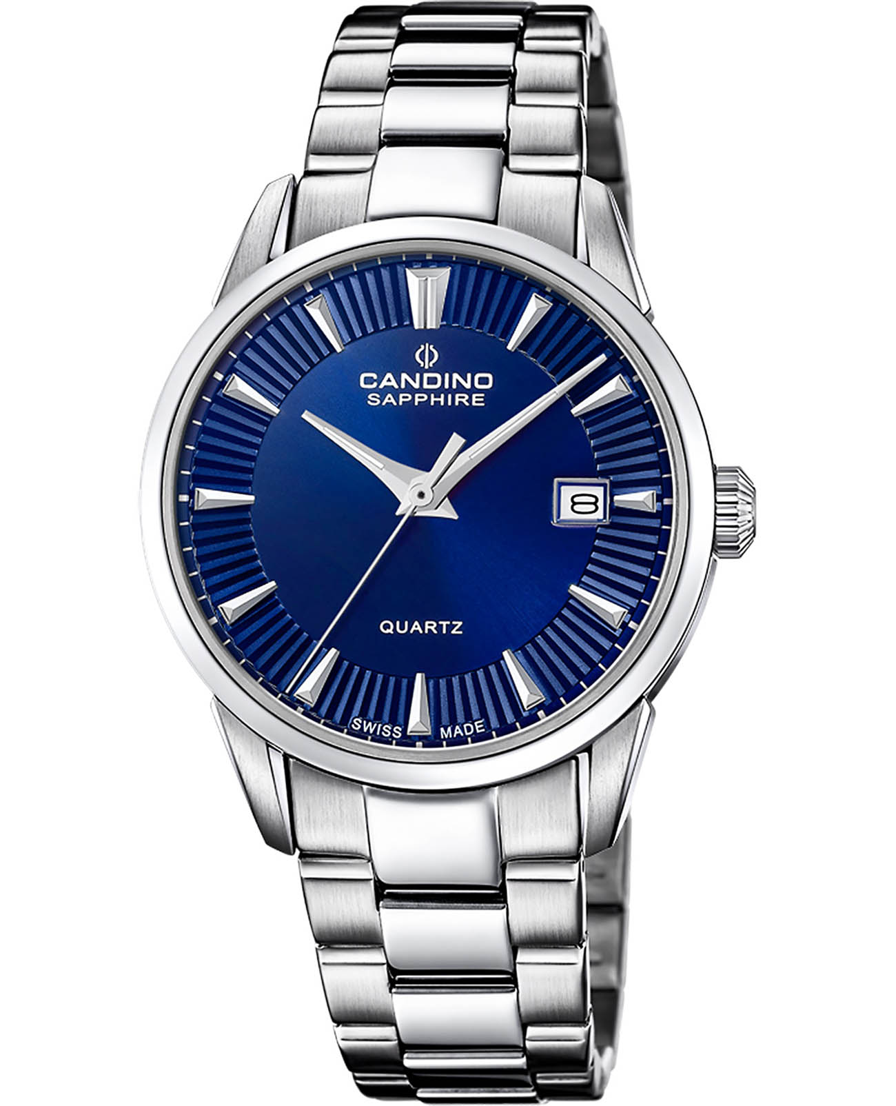 Мужские часы Candino C4711/F — это классический швейцарский дизайн и надёжность. Корпус круглой формы выполнен из нержавеющей стали и защищён сапфировым стекломСапфировое стеклоПрочный и надёжный материал из кристалла сапфира синтетического происхождения, характеризующийся особой твёрдостью и устойчивостью к царапинам и повреждениям., устойчивым к царапинам. Циферблат синего цвета сочетается с браслетом из нержавеющей стали, который фиксируется на застёжке «бабочка» с кнопкамиЗастёжка "бабочка"Такой вид застёжки дополняется предохранителями, помогающими избежать случайного раскрытия браслета. Обладают изящным исполнением. . Водонепроницаемость составляет 100 WR, что позволяет использовать часы для плавания, ныряния и других водных видов спорта. Модель отличается лаконичным стилем, высокой прочностью и идеально подходит для повседневного и делового образа.