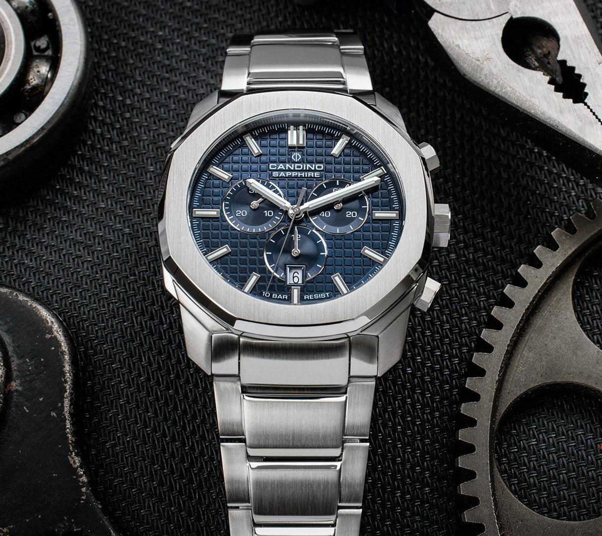 Швейцарские мужские наручные часы-хронографХронографФункция позволяет измерять отрезки времени с особой точностью: часы, минуты, секунды. Верным признаком хронографа является наличие на циферблате 3 дополнительных окошек-счётчиков. Candino Chronos Carree C4746/2, кварцевый механизм с высокой точностью. Сапфировое стеклоСапфировое стеклоПрочный и надёжный материал из кристалла сапфира синтетического происхождения, характеризующийся особой твёрдостью и устойчивостью к царапинам и повреждениям. устойчивое к появлению царапин, обладающее высокой прозрачностью. Часы, минуты, секунды. Индикация даты. Класс водозащиты: 100 метров, позволит плавать, нырять и заниматься другими водными видами спорта. Корпус часов изготовлен из нержавеющей стали. Стрелки и метки с люминесцентным покрытиемЛюминесцентное покрытиеПозволяет считывать показания времени в темноте. Производители наносят на стрелки, часовые индексы, безель или поверхность циферблата светонакопительный состав, дающий холодное свечение..Стальной браслет на раскладной застёжкеРаскладная застёжкаТакой тип застёжки используется только на браслетах из металла. Она никогда не раскрывается полностью, происходит разделение на 2 и более частей. Раскладывающая застёжка снизит вероятность потери часов к минимуму..
