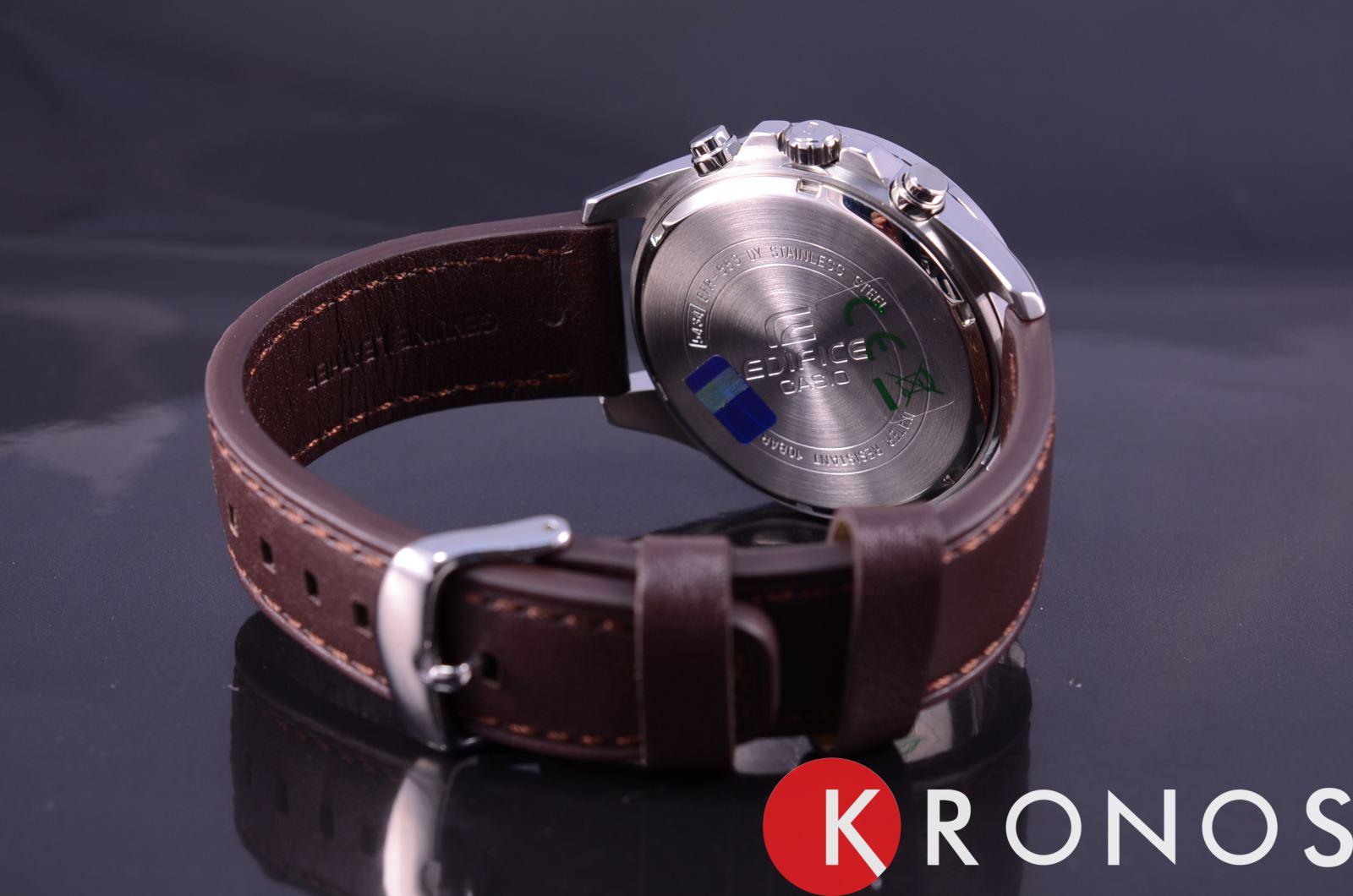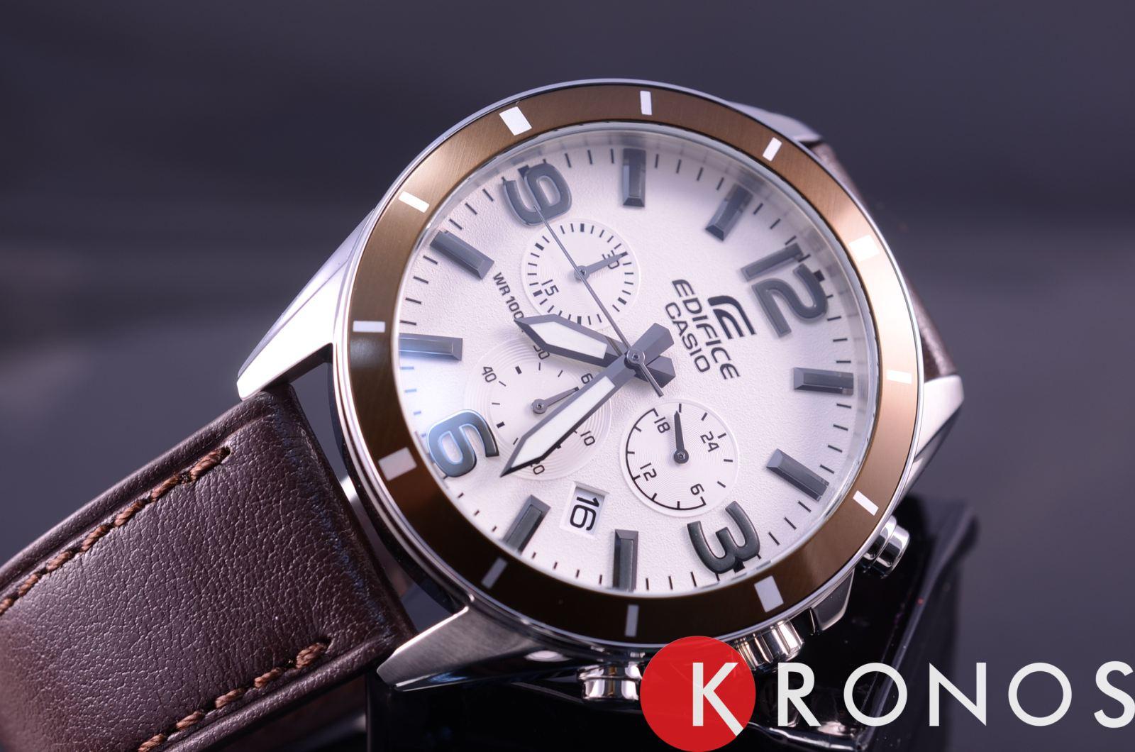 Мужские классические наручные часы Casio Edifice надежные и практичные. Кварцевый японский механизм Miyota. Точность хода не хуже -10 +15 сек./в месяц. Часы оснащены функцией хронографа. Циферблат белого цвета с контрастными индексами. Стрелки и индексы с светонакопительным нанесением. Корпус выполнен из нержавеющей стали. Безель с IP покрытием коричневого цвета. Ремешок из натуральной кожи, коричневого цвета. Минеральное стекло устойчиво к появлению царапин. Водонепроницаемость 100М. В часах можно плавать. Степень водонепроницаемости не является величиной, эквивалентной функциональной рабочей глубине.