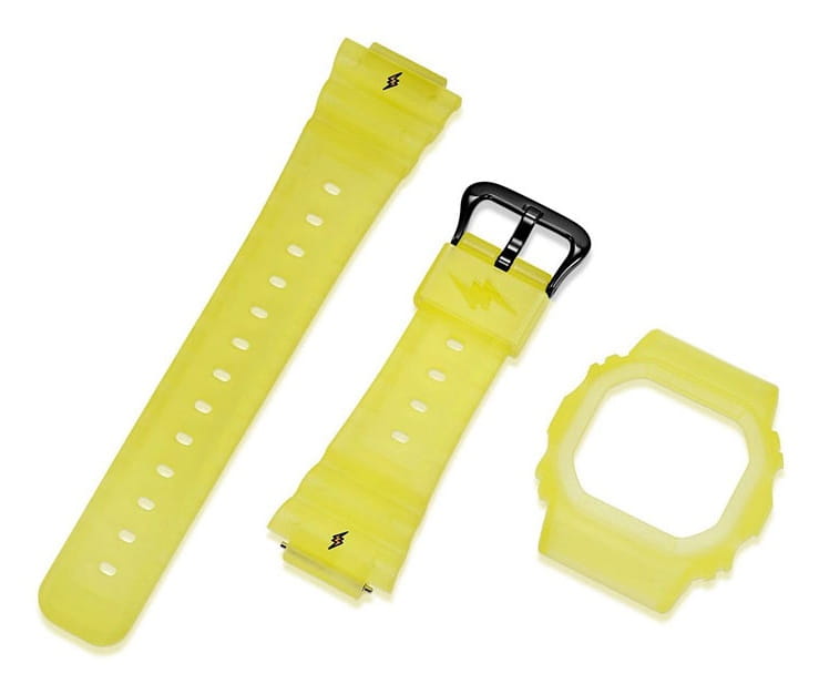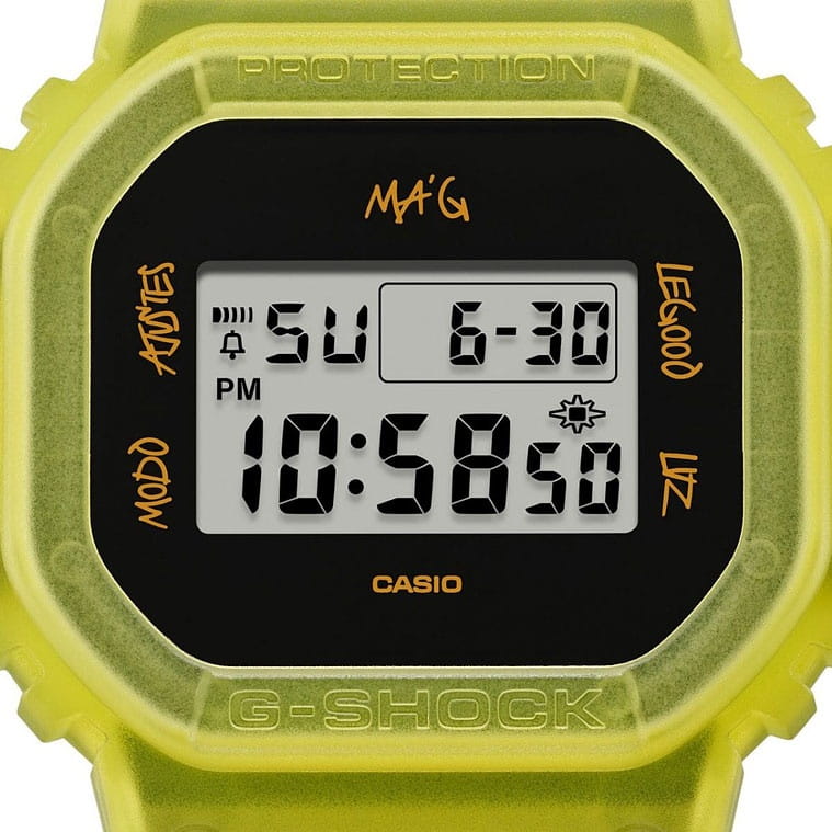 Часы выполнены в узнаваемом прямоугольном силуэте . В комплекте — два корпуса : полупрозрачный желтый и черный, а также сменный ремешок для создания индивидуального образа. Подписи режимов на циферблате выполнены от руки артистом на испанском языке, а фирменный элемент «MA’G» в виде молнии стал главным дизайнерским акцентом.