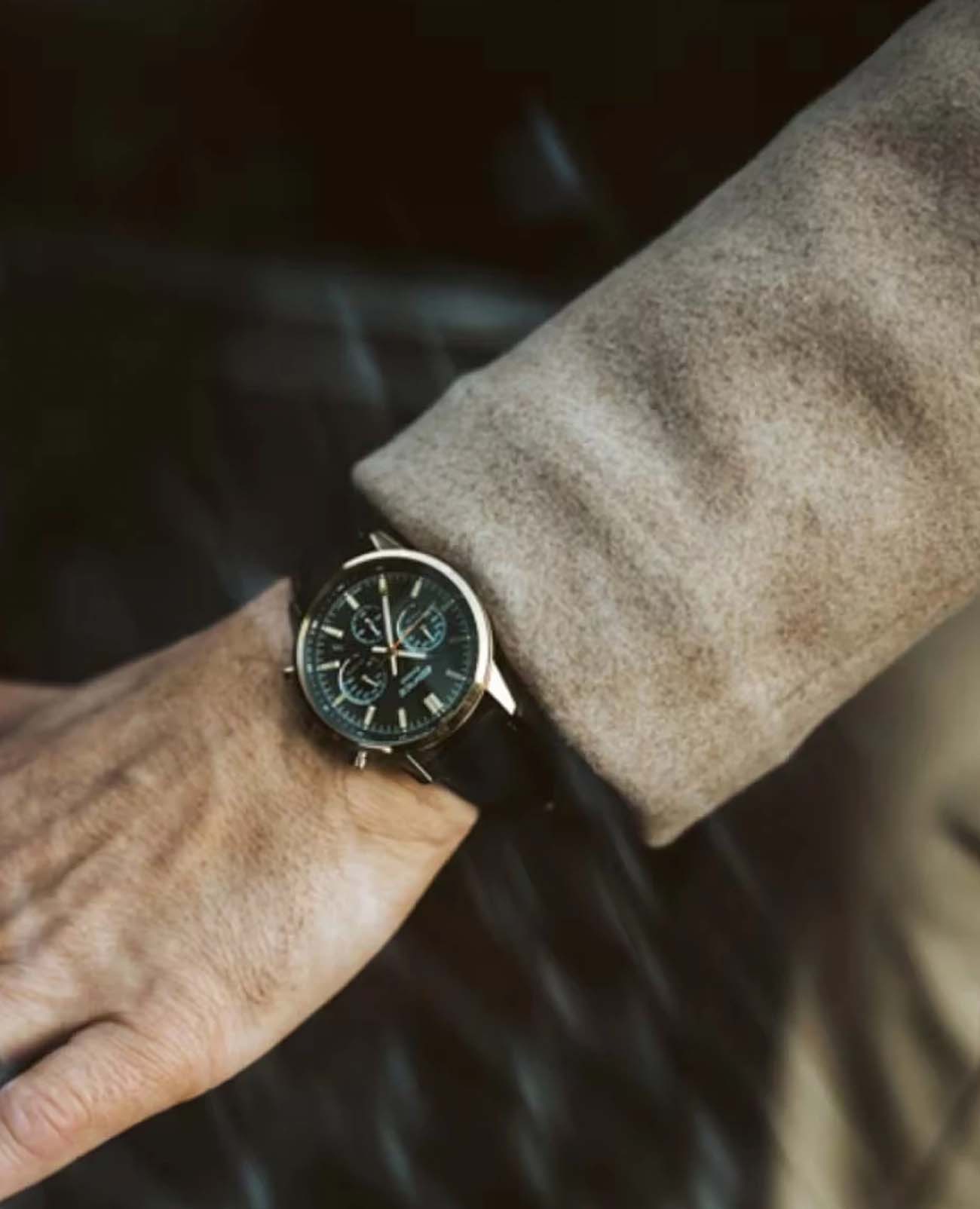 Завершает образ черный кожаный ремешок с перфорацией , обеспечивающий комфорт и дышащий эффект при ежедневном ношении. Застежка классическая, удобная и надёжная. В комплекте — батарейка, рассчитанная на 2 года автономной работы .