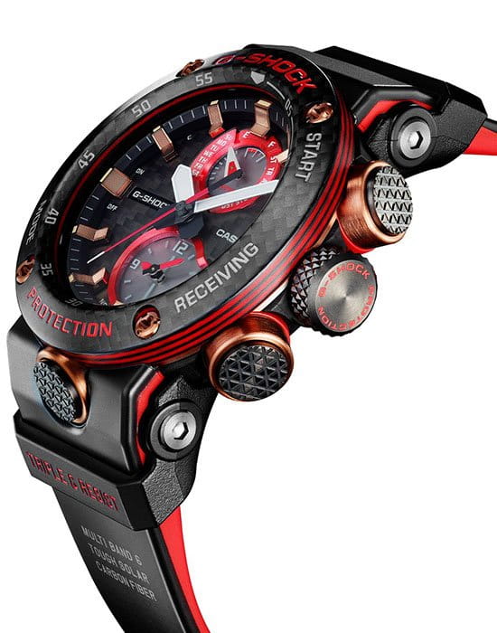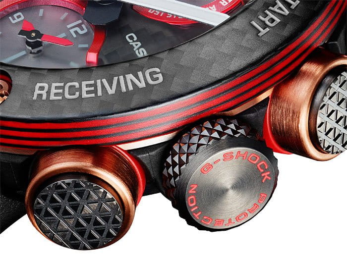 Внушительный аксессуар стильно смотрится на широком запястье, гармонично смотрятся крупные детали в красном и бронзовом цвете. Задняя крышка здесь отсутствует, ударопрочный корпусУдаропрочный корпусМеханизм заключён в корпус, выполненный из современных материалов, устойчивых к ударам, механическим повреждениям и падению с высоты: инновационный пластик, карбон, нержавеющая сталь, титан. сделан из монолитного углеродного монокока, вдохновлённого конструкцией ранних самолётов. Он состоит из 52 карбоновых слоёв, уникальная текстура просматривается на боковых частях безеляБезельВнешний ободок, закрепляющий стекло. В спортивных часах так называется поворотное кольцо с делениями на циферблате, выполняет роль таймера – замеряет отрезки времени на шкале. Неподвижный безель – элемент декора. Однонаправленно вращающийся безель на дайверских часах позволяет фиксировать моменты погружения и выныривания на поверхность. – с успехом реализована технология Carbon Core GuardCarbon Core Guard Новейшая структура корпуса, разработанная Casio. Полиуретановая пластина дополнительно усилена карбоновыми вставками, что придаёт специальную защиту от механических повреждений. Карбон отличается лёгкостью и прочностью.. Полимерный ремешок тоже имеет усиление карбоновыми волокнами. Наручные часы обладают полезным функционалом: BluetoothBluetoothСовременная технология, позволяющая синхронизировать часы с телефоном и переносить данные. Часы с Bluetooth расширяют возможности вашего смартфона и делают его использование ещё более удобным., будильник, мировое времяМировое время Полезное часовое усложнение, отображающее время в основных городах и известных областях по всему миру, оно связано с часовыми поясами, удобно для путешественников и бизнесменов. , таймер, приём радиосигнала, питание от солнечной батареи . Сапфировое стекло с антибликовой обработкой. Яркая люминесцентная подсветкаЛюминесцентное покрытиеПозволяет считывать показания времени в темноте. Производители наносят на стрелки, часовые индексы, безель или поверхность циферблата светонакопительный состав, дающий холодное свечение.. Габариты: 50,1 x 46,4 x 16,9 мм.