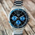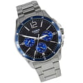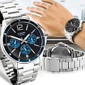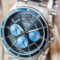Японские мужские наручные часы с минеральным стекломМинеральное стеклоМинеральное стекло представляет собой искусственно выращенный минерал кварца. Такое стекло отличается особой устойчивостью к повреждениям и царапинам. Уступает по некоторым качествам сапфировому стеклу. Casio Collection MTP-1374D-2A, кварцевый механизм с высокой точностью. Класс водозащиты: 50 метров, позволит защитить корпус от случайных брызг или капель дождя. Корпус часов изготовлен из стали. Стальной браслет на раскладной застёжкеРаскладная застёжкаТакой тип застёжки используется только на браслетах из металла. Она никогда не раскрывается полностью, происходит разделение на 2 и более частей. Раскладывающая застёжка снизит вероятность потери часов к минимуму.. Стрелки с люминесцентным покрытиемЛюминесцентное покрытиеПозволяет считывать показания времени в темноте. Производители наносят на стрелки, часовые индексы, безель или поверхность циферблата светонакопительный состав, дающий холодное свечение.. 12-ти и 24-х часовой формат времени, число и день недели вынесены на отдельные циферблаты. Метки в виде штрихов и арабской цифры 12. Заводная головка с защитой. БезельБезельВнешний ободок, закрепляющий стекло. В спортивных часах так называется поворотное кольцо с делениями на циферблате, выполняет роль таймера – замеряет отрезки времени на шкале. Неподвижный безель – элемент декора. Однонаправленно вращающийся безель на дайверских часах позволяет фиксировать моменты погружения и выныривания на поверхность. с IP-покрытиемIP-покрытиеМетод ионного напыления. Демонстрирует повышенную устойчивость к истиранию, окислению и химическим веществам. Под воздействием высокого давления и температуры около 1500°C молекулы металла надёжно соединяются с частицами корпуса часов..
