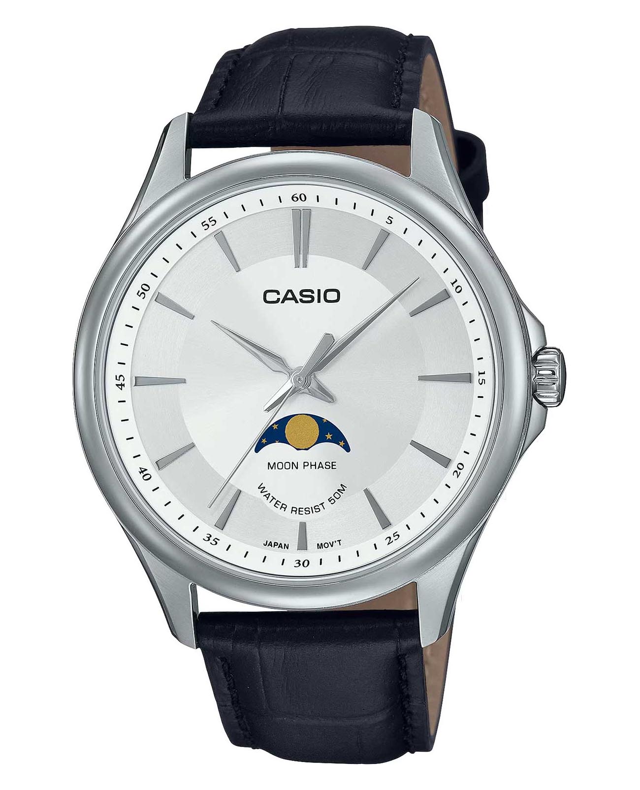 Японские мужские часы с минеральным стекломМинеральное стеклоМинеральное стекло представляет собой искусственно выращенный минерал кварца. Такое стекло отличается особой устойчивостью к повреждениям и царапинам. Уступает по некоторым качествам сапфировому стеклу. Casio CollectionMTP-M100L-7A, кварцевый механизм с высокой точностью. Корпус часов изготовлен из стали. Циферблат с метками в виде штрихов выполнен по технологии Sunray (солнечные лучи). Отображение фаз Луны. Заводная головка с защитой. Батарейка рассчитана на 3 года. Задняя крышка с винтовым фиксатором. Класс водозащиты: 50 метров, позволит защитить корпус от случайных брызг или капель дождя. Кожаный ремешок на стандартной застёжке.
