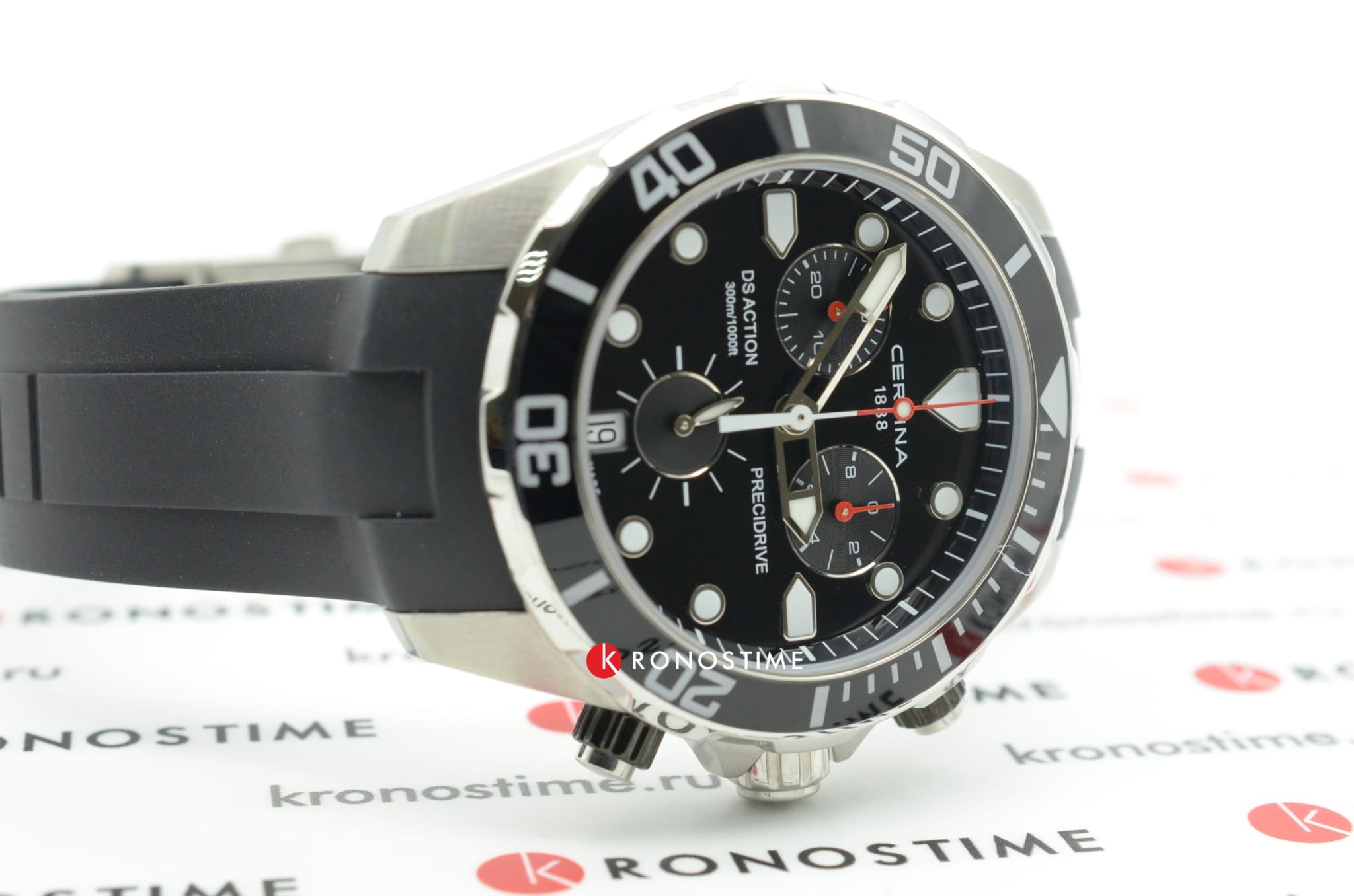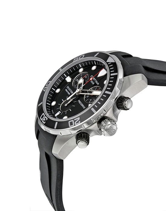 Наручные часы отличаются привлекательным дизайном, чёрный циферблат имеет крупную индикацию времени, расставлены акценты красного цвета. Модель комплектуется кварцевым механизмом ETA Precidrive™Precidrive™Инновационный кварцевый механизм Certina. Часы, оснащённые этим швейцарским калибром, приравниваются к точности к сертифицированным хронометрам, точность хода составляет +/-10 секунд в год., отличающимся отменной точностью хода. Вращающийся безельБезельВнешний ободок, закрепляющий стекло. В спортивных часах так называется поворотное кольцо с делениями на циферблате, выполняет роль таймера – замеряет отрезки времени на шкале. Неподвижный безель – элемент декора. Однонаправленно вращающийся безель на дайверских часах позволяет фиксировать моменты погружения и выныривания на поверхность. имеет чёрное PVD-покрытиеPVDУльтратонкое покрытие наносится в технике вакуумного напыления, сочетает в себе нитрид титана особой прочности со слоем золота или оксида хрома. Несёт в себе декоративную или защитную функцию., защищающее от царапин. Сапфировое стекло с антибликовой обработкой. Силиконовый ремешок. Индикатор EOLEOLПредставляет собой систему, уведомляющую владельца часов о необходимости замены элемента питания. За 2 недели до полного разряда батарейки секундная стрелка перестаёт ходить чётко и начинает перепрыгивать на 3-4 деления.. Секундомер, хронографХронографФункция позволяет измерять отрезки времени с особой точностью: часы, минуты, секунды. Верным признаком хронографа является наличие на циферблате 3 дополнительных окошек-счётчиков., окошко даты. Диаметр корпуса: 43 мм.