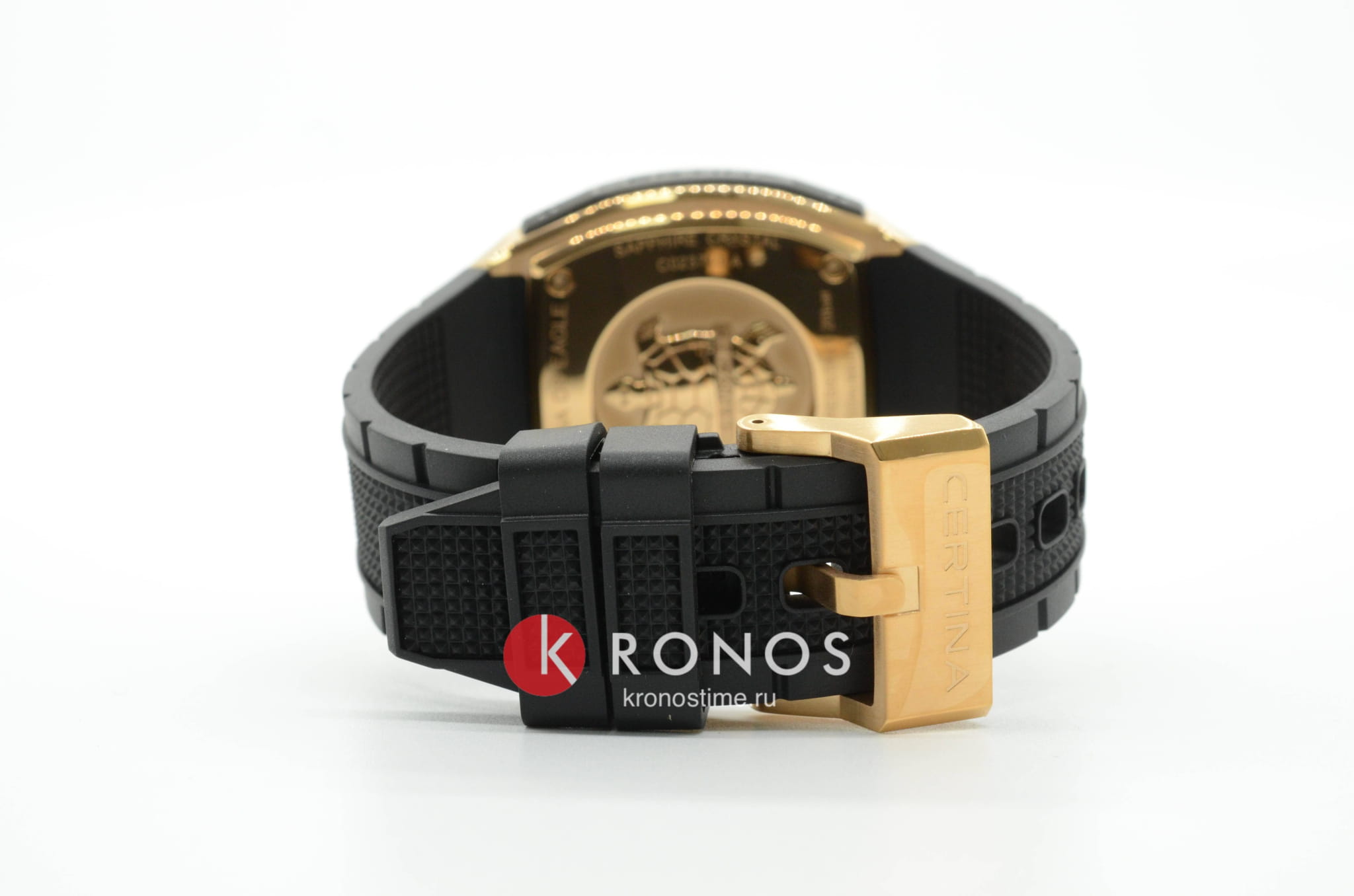 Аксессуар в спортивном стиле оснащён швейцарским кварцевым калибром ETA F07.411 Precidrive™Precidrive™Инновационный кварцевый механизм Certina. Часы, оснащённые этим швейцарским калибром, приравниваются к точности к сертифицированным хронометрам, точность хода составляет +/-10 секунд в год.. Часы основаны на концепции Двойной Надёжности DS ConceptDS ConceptDouble Security Concept, обозначает двойную надёжность и безупречную точность часов Certina. Двойная система защиты подразумевает обеспечение максимальной устойчивости к ударам и высоких показателей водонепроницаемости.. Стальной корпус защищён PVD-покрытиемPVDУльтратонкое покрытие наносится в технике вакуумного напыления, сочетает в себе нитрид титана особой прочности со слоем золота или оксида хрома. Несёт в себе декоративную или защитную функцию. золотистого цвета. Ремешок сделан из прочного, надёжного каучука.