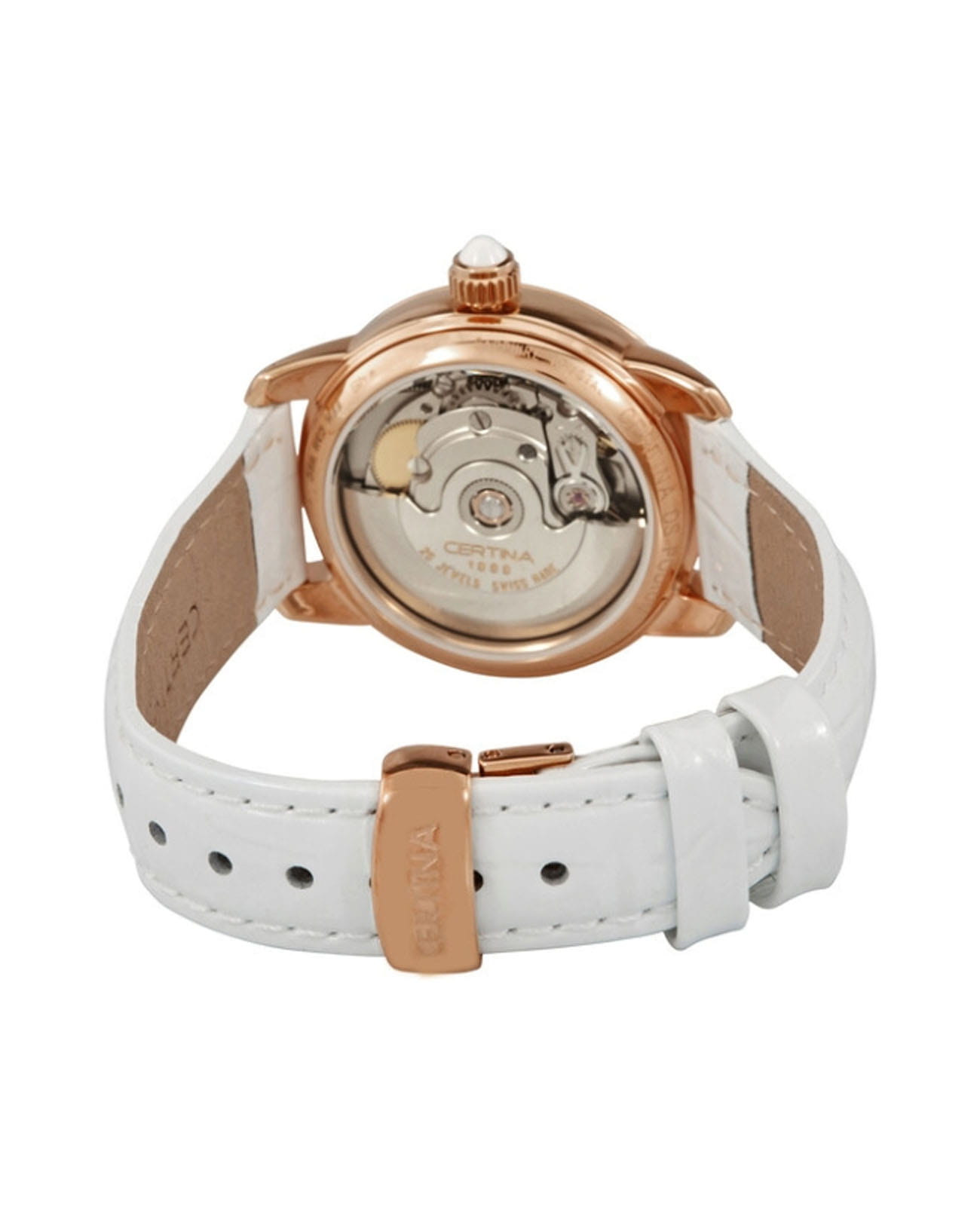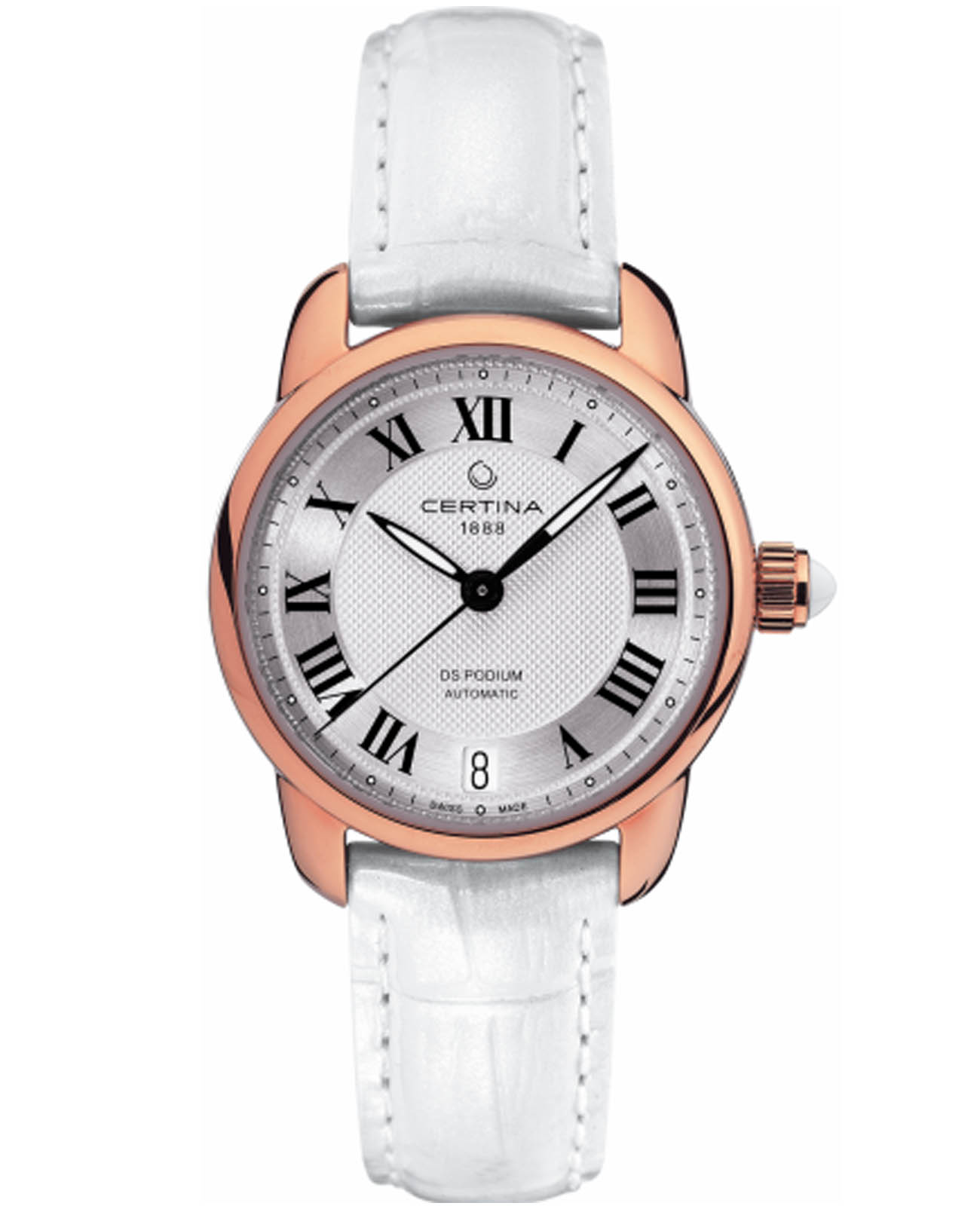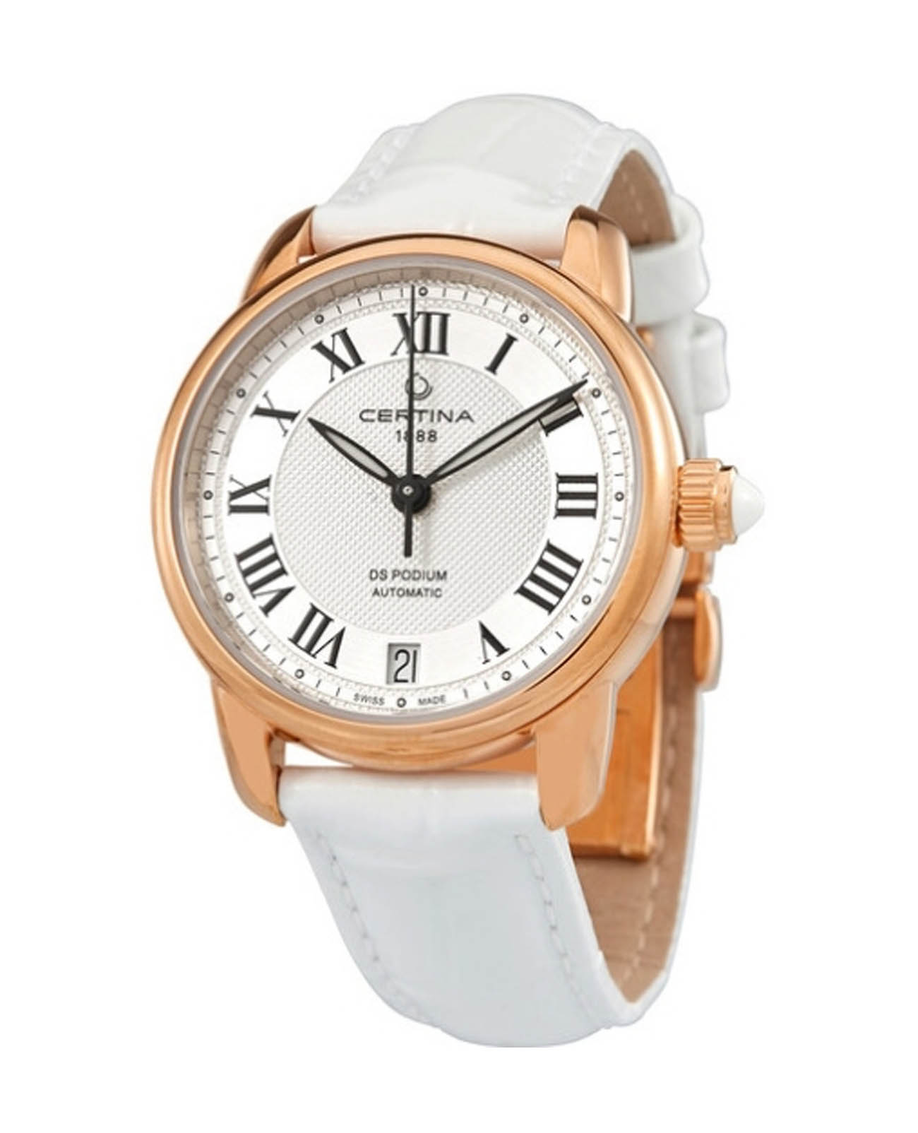 Женские швейцарские механические часы с автоподзаводом Certina DS Podium C0252073603800. Сапфировое стеклоСапфировое стеклоПрочный и надёжный материал из кристалла сапфира синтетического происхождения, характеризующийся особой твёрдостью и устойчивостью к царапинам и повреждениям. устойчивое к появлению царапин, обладающее высокой прозрачностью. Корпус изготовлен из нержавеющей стали с IP-покрытиемIP-покрытиеМетод ионного напыления. Демонстрирует повышенную устойчивость к истиранию, окислению и химическим веществам. Под воздействием высокого давления и температуры около 1500°C молекулы металла надёжно соединяются с частицами корпуса часов.. Стрелки с люминесцентным покрытиемЛюминесцентное покрытиеПозволяет считывать показания времени в темноте. Производители наносят на стрелки, часовые индексы, безель или поверхность циферблата светонакопительный состав, дающий холодное свечение.. Окошко даты находится в положении 6 часов. Класс водозащиты: 100 метров, позволит плавать, нырять и заниматься другими водными видами спорта. Кожаный ремешок на стандартной застежке.