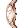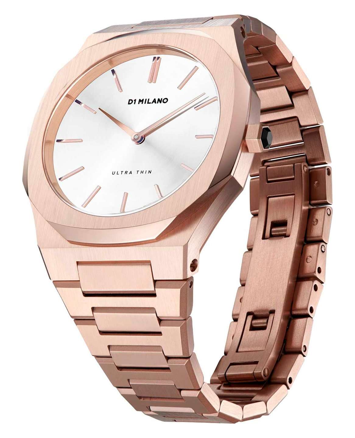 Женские наручные часы D1 Milano UTBL09 из коллекции Ultra Thin сочетают в себе элегантный дизайн и современные технологии. Модель обладает тоннельным корпусом диаметром 34 мм, изготовленным из высококачественной нержавеющей стали 316L с PVD-покрытиемPVDУльтратонкое покрытие наносится в технике вакуумного напыления, сочетает в себе нитрид титана особой прочности со слоем золота или оксида хрома. Несёт в себе декоративную или защитную функцию. в розовое золото, что обеспечивает устойчивость к внешним воздействиям. Толщина ультратонкого корпуса составляет всего 6 мм, делая аксессуар легким и удобным для повседневного использования. Браслет также выполнен из нержавеющей стали с раскладной застежкойРаскладной замокДанный вариант застежки используется только на часах с металлическим браслетом. Отличительная особенность такого крепления в том, что длина браслета становится универсальной и вы можете самостоятельно отрегулировать нужный вам размер – застежка просто двигается по браслету часов., гарантирующей комфортное ношение и безопасность. Циферблат цвета "розовое облако" украшен метками в виде штрихов и оснащен стрелочным механизмом в тон корпуса, который подчеркивает элегантность модели. Для защиты используется сапфировое стеклоСапфировое стеклоПрочный и надёжный материал из кристалла сапфира синтетического происхождения, характеризующийся особой твёрдостью и устойчивостью к царапинам и повреждениям., обеспечивающее прочную защиту от царапин и бликов. Часы работают на кварцевом механизме Miyota 1L22, гарантирующем точность хода без необходимости регулярного подзавода. Водонепроницаемость часов достигает 5 атмосфер (50 метров), что позволяет использовать их во время мытья рук или плавания, однако не рекомендуется для глубоководного дайвинга.