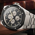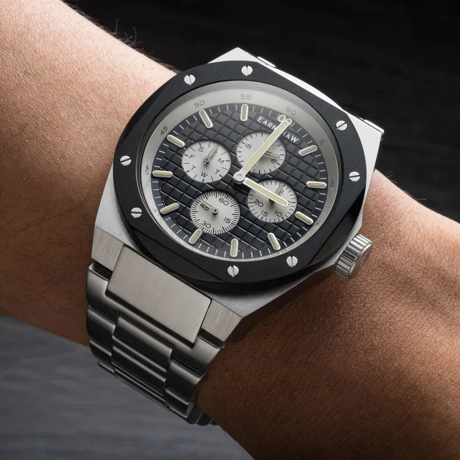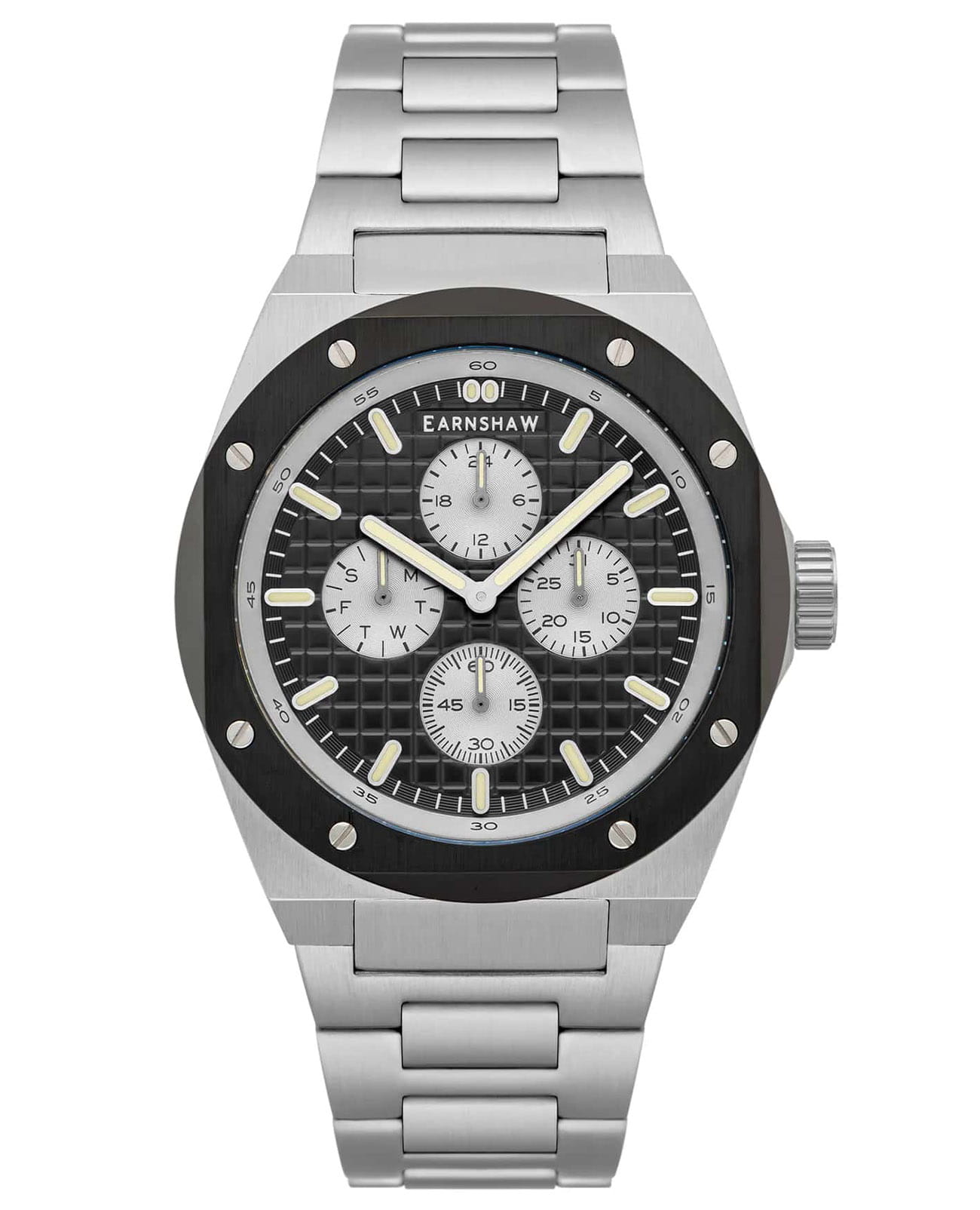 Мужские наручные часы с минеральным стекломМинеральное стеклоМинеральное стекло представляет собой искусственно выращенный минерал кварца. Такое стекло отличается особой устойчивостью к повреждениям и царапинам. Уступает по некоторым качествам сапфировому стеклу. Earnshaw Bessemer ES-8253-44, кварцевый механизм. Класс водозащиты: 100 метров, позволит защитить корпус от воды. Корпус часов изготовлен из стали.  Центральные часовая и минутная стрелки, секундная стрелка вынесена на малый циферблат. Люминесцентная подсветкаЛюминесцентное покрытиеПозволяет считывать показания времени в темноте. Производители наносят на стрелки, часовые индексы, безель или поверхность циферблата светонакопительный состав, дающий холодное свечение. стрелок и меток. Отображение даты и дня недели в малых циферблатах. 12/24х часовой формат времени. Черный циферблат с серебристыми элементами. Неподвижный безель с IP-покрытиемIP-покрытиеМетод ионного напыления. Демонстрирует повышенную устойчивость к истиранию, окислению и химическим веществам. Под воздействием высокого давления и температуры около 1500°C молекулы металла надёжно соединяются с частицами корпуса часов.. Корпус выполнен из нержавеющей стали. Диаметр корпуса составляет 44 мм, толщина 14 мм. Стальной браслет с раскладной застёжкойРаскладная застёжкаТакой тип застёжки используется только на браслетах из металла. Она никогда не раскрывается полностью, происходит разделение на 2 и более частей. Раскладывающая застёжка снизит вероятность потери часов к минимуму.