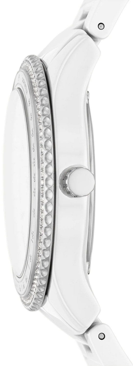 Женские наручные часы Fossil на браслете Fossil Stella CE1113, кварцевый механизм с высокой точностью. Класс водозащиты: 50 метров, позволит защитить корпус от случайных брызг или капель дождя. Стрелки с люминесцентным покрытиемЛюминесцентное покрытиеПозволяет считывать показания времени в темноте. Производители наносят на стрелки, часовые индексы, безель или поверхность циферблата светонакопительный состав, дающий холодное свечение.. БезельБезельВнешний ободок, закрепляющий стекло. В спортивных часах так называется поворотное кольцо с делениями на циферблате, выполняет роль таймера – замеряет отрезки времени на шкале. Неподвижный безель – элемент декора. Однонаправленно вращающийся безель на дайверских часах позволяет фиксировать моменты погружения и выныривания на поверхность. украшен кристаллами. Корпус часов изготовлен из стали. Керамический браслет с раскладной застёжкойРаскладная застёжкаТакой тип застёжки используется только на браслетах из металла. Она никогда не раскрывается полностью, происходит разделение на 2 и более частей. Раскладывающая застёжка снизит вероятность потери часов к минимуму..