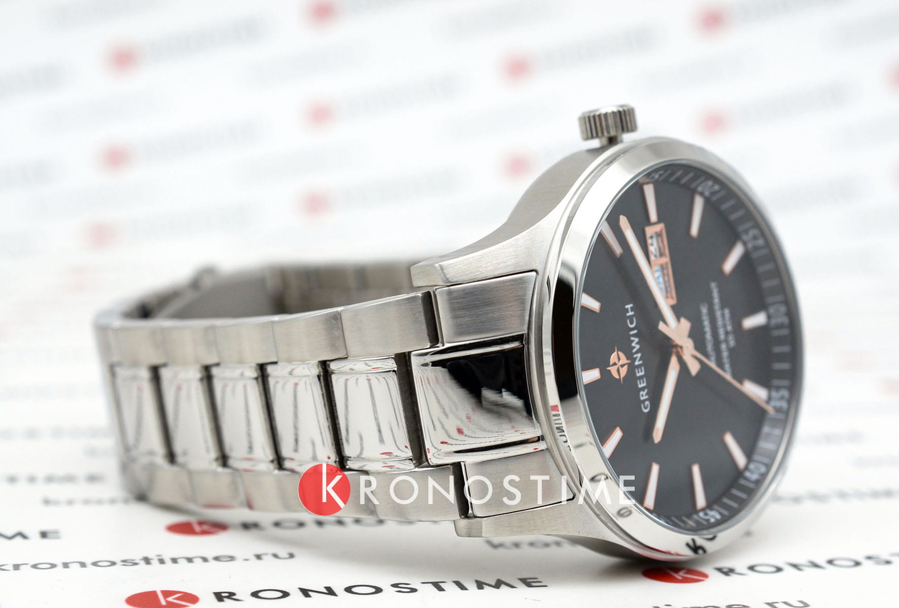 Мужские часы Greenwich Good Luck GW 054.10.30, механический механизм (автоматический калибр) с минеральным стекломМинеральное стеклоМинеральное стекло представляет собой искусственно выращенный минерал кварца. Такое стекло отличается особой устойчивостью к повреждениям и царапинам. Уступает по некоторым качествам сапфировому стеклу.. Корпус из нержавеющей стали. Стрелки и метки с люминесцентным покрытиемЛюминесцентное покрытиеПозволяет считывать показания времени в темноте. Производители наносят на стрелки, часовые индексы, безель или поверхность циферблата светонакопительный состав, дающий холодное свечение.. Окошко даты и дня недели находится в положении 3 часа. Класс водозащиты: 100 метров, позволит плавать, нырять и заниматься другими водными видами спорта. Стальной браслет на раскладной застёжкеРаскладная застёжкаТакой тип застёжки используется только на браслетах из металла. Она никогда не раскрывается полностью, происходит разделение на 2 и более частей. Раскладывающая застёжка снизит вероятность потери часов к минимуму..