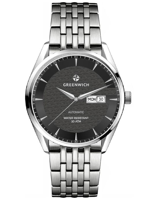 Мужские часы с минеральным стекломМинеральное стеклоМинеральное стекло представляет собой искусственно выращенный минерал кварца. Такое стекло отличается особой устойчивостью к повреждениям и царапинам. Уступает по некоторым качествам сапфировому стеклу. Greenwich Good Luck Classic GW 074.10.31, представляют собой классический вариант для повседневной носки. В центральной части циферблата — отличительная черта моделей этой серии: гильоше, объемные линии которого напоминают волны. Обратите внимание на форму пластины, где крепятся накладные риски: она сделана в форме латинской буквы G, первой буквы в названии бренда. Часы характеризуются традиционными формами, лаконичным исполнением, что делает модель элегантным дополнением к деловому костюму. Сквозь прозрачную заднюю крышку вы увидите детали механизма TMI с декорированным ротором: на нем выгравировано изображение символа английских моряков — парусника. Браслет и застежка-клипса выполнены из гипоаллергенной нержавеющей стали. Дизайн, актуальный для любого современного образа, и надежность используемых материалов делают автоматические часы Greenwich удобным и стильным аксессуаром на каждый день.