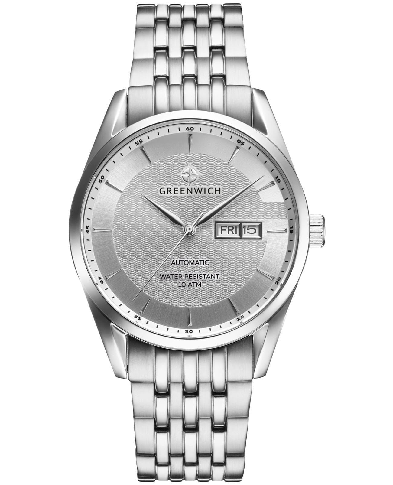 Мужские часы с минеральным стекломМинеральное стеклоМинеральное стекло представляет собой искусственно выращенный минерал кварца. Такое стекло отличается особой устойчивостью к повреждениям и царапинам. Уступает по некоторым качествам сапфировому стеклу. Greenwich Good Luck Classic GW 074.10.33, представляют собой классический вариант для повседневной носки. В центральной части циферблата — отличительная черта моделей этой серии: гильоше, объемные линии которого напоминают волны. Обратите внимание на форму пластины, где крепятся накладные риски: она сделана в форме латинской буквы G, первой буквы в названии бренда. Часы характеризуются традиционными формами, лаконичным исполнением, что делает модель элегантным дополнением к деловому костюму. Сквозь прозрачную заднюю крышку вы увидите детали механизма TMI с декорированным ротором: на нем выгравировано изображение символа английских моряков — парусника. Браслет на раскладной застёжкеРаскладная застёжкаТакой тип застёжки используется только на браслетах из металла. Она никогда не раскрывается полностью, происходит разделение на 2 и более частей. Раскладывающая застёжка снизит вероятность потери часов к минимуму. выполнены из гипоаллергенной нержавеющей стали. Дизайн, актуальный для любого современного образа, и надежность используемых материалов делают автоматические часы Greenwich удобным и стильным аксессуаром на каждый день. Окошко даты и дня недели находится в положении 3 часа.
