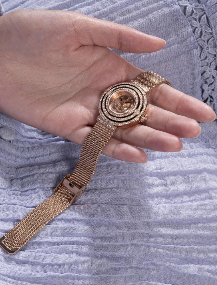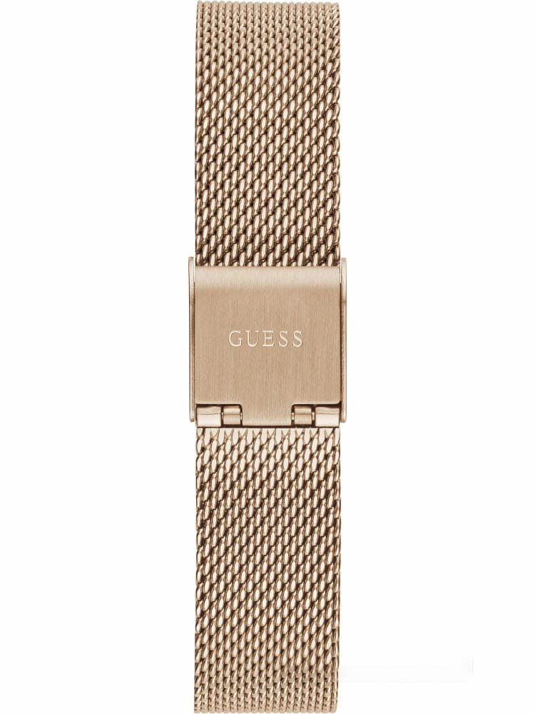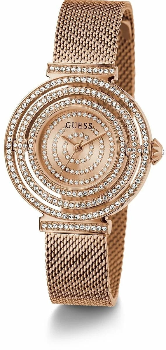 Женские наручные часы Guess GW0550L3 с минеральным стекломМинеральное стеклоМинеральное стекло представляет собой искусственно выращенный минерал кварца. Такое стекло отличается особой устойчивостью к повреждениям и царапинам. Уступает по некоторым качествам сапфировому стеклу., кварцевый механизм с высокой точностью. Класс водозащиты: 30 метров, позволит защитить корпус от случайных брызг или капель дождя. Корпус часов изготовлен из стали с IP-покрытиемIP-покрытиеМетод ионного напыления. Демонстрирует повышенную устойчивость к истиранию, окислению и химическим веществам. Под воздействием высокого давления и температуры около 1500°C молекулы металла надёжно соединяются с частицами корпуса часов.. Браслет с раскладной застёжкойРаскладная застёжкаТакой тип застёжки используется только на браслетах из металла. Она никогда не раскрывается полностью, происходит разделение на 2 и более частей. Раскладывающая застёжка снизит вероятность потери часов к минимуму. с IP-покрытиемIP-покрытиеМетод ионного напыления. Демонстрирует повышенную устойчивость к истиранию, окислению и химическим веществам. Под воздействием высокого давления и температуры около 1500°C молекулы металла надёжно соединяются с частицами корпуса часов.. Корпус и циферблат украшены кристаллами. Круглый стальной корпус, украшенный кристаллами. Циферблат выполнен по технологии Sunray (солнечные лучи). Браслет миланского плетения.