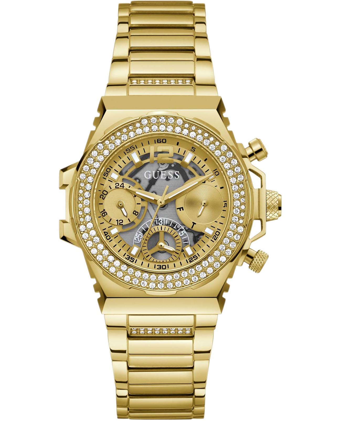 Женские наручные часы Guess Sport Steel GW0552L2 с минеральным стекломМинеральное стеклоМинеральное стекло представляет собой искусственно выращенный минерал кварца. Такое стекло отличается особой устойчивостью к повреждениям и царапинам. Уступает по некоторым качествам сапфировому стеклу., кварцевый механизм с высокой точностью. 24-х часовой формат времени, число и день недели отображаются на отдельных циферблатах. Стрелки и метки с люминесцентным покрытиемЛюминесцентное покрытиеПозволяет считывать показания времени в темноте. Производители наносят на стрелки, часовые индексы, безель или поверхность циферблата светонакопительный состав, дающий холодное свечение.. Класс водозащиты: 50 метров, позволит защитить корпус от случайных брызг или капель дождя. Корпус часов и браслет изготовлены из стали с IP-покрытиемIP-покрытиеМетод ионного напыления. Демонстрирует повышенную устойчивость к истиранию, окислению и химическим веществам. Под воздействием высокого давления и температуры около 1500°C молекулы металла надёжно соединяются с частицами корпуса часов.. БезельБезельВнешний ободок, закрепляющий стекло. В спортивных часах так называется поворотное кольцо с делениями на циферблате, выполняет роль таймера – замеряет отрезки времени на шкале. Неподвижный безель – элемент декора. Однонаправленно вращающийся безель на дайверских часах позволяет фиксировать моменты погружения и выныривания на поверхность. инкрустирован кристаллами. Браслет с раскладной застёжкойРаскладная застёжкаТакой тип застёжки используется только на браслетах из металла. Она никогда не раскрывается полностью, происходит разделение на 2 и более частей. Раскладывающая застёжка снизит вероятность потери часов к минимуму..