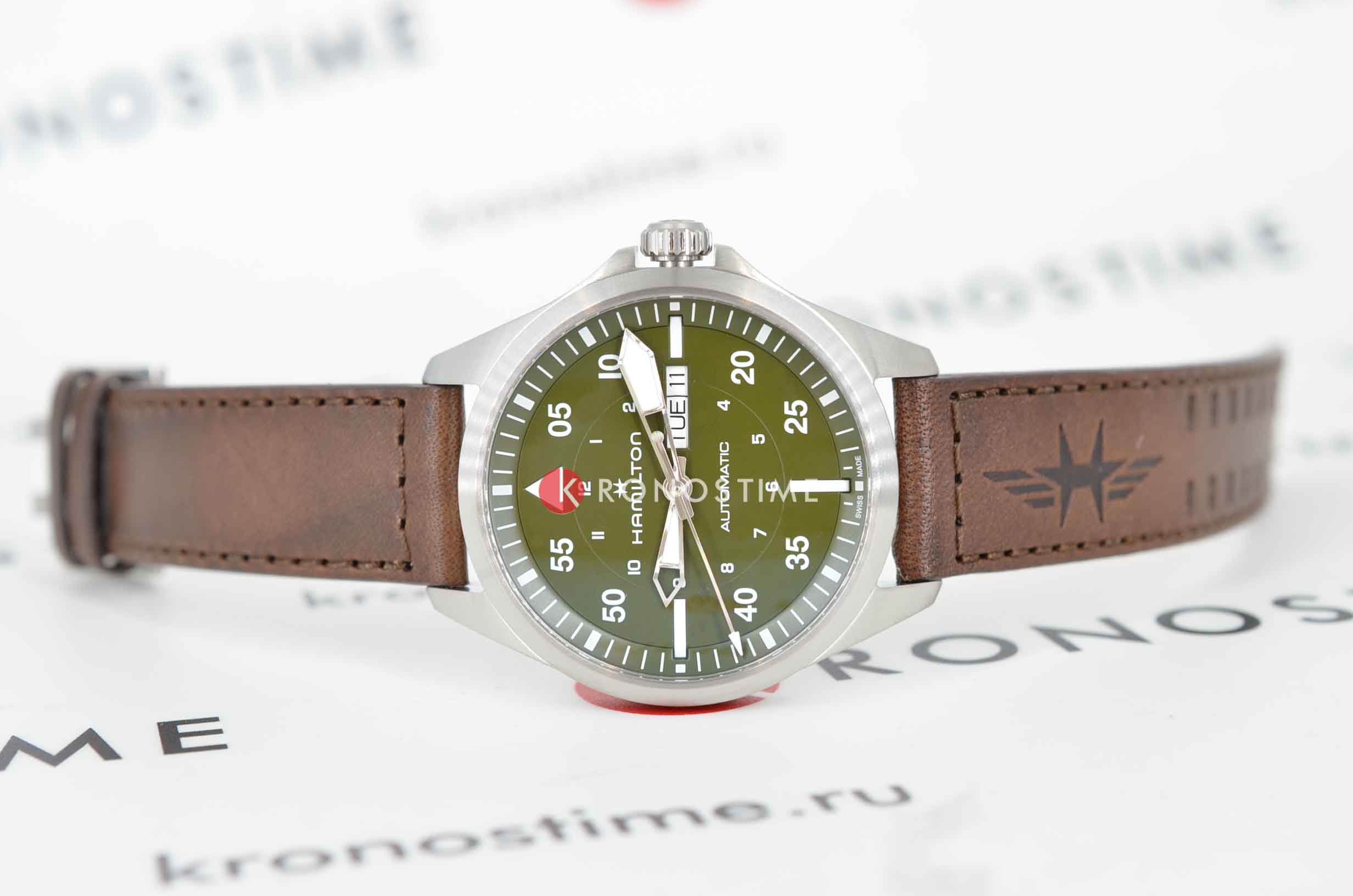 Мужские механические швейцарские часы Hamilton Khaki Aviation Pilot Day Date Auto H64635560, механический механизм (автоматический калибр) с высокой точностью. Сапфировое стеклоСапфировое стеклоПрочный и надёжный материал из кристалла сапфира синтетического происхождения, характеризующийся особой твёрдостью и устойчивостью к царапинам и повреждениям. устойчивое к появлению царапин, обладающее высокой прозрачностью. Класс водозащиты: 100 метров, позволит плавать, нырять и заниматься другими водными видами спорта. Корпус часов изготовлен из нержавеющей стали. Часы оснащены спиралью баланса из сплава Nivachron™Nivachron™Специально разработанный инновационный сплав Nivachron™ повышает устойчивость часов к воздействию магнитных полей.. Кожаный ремешок.