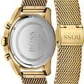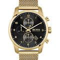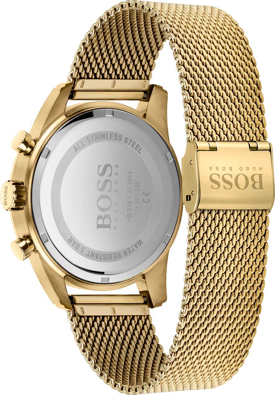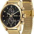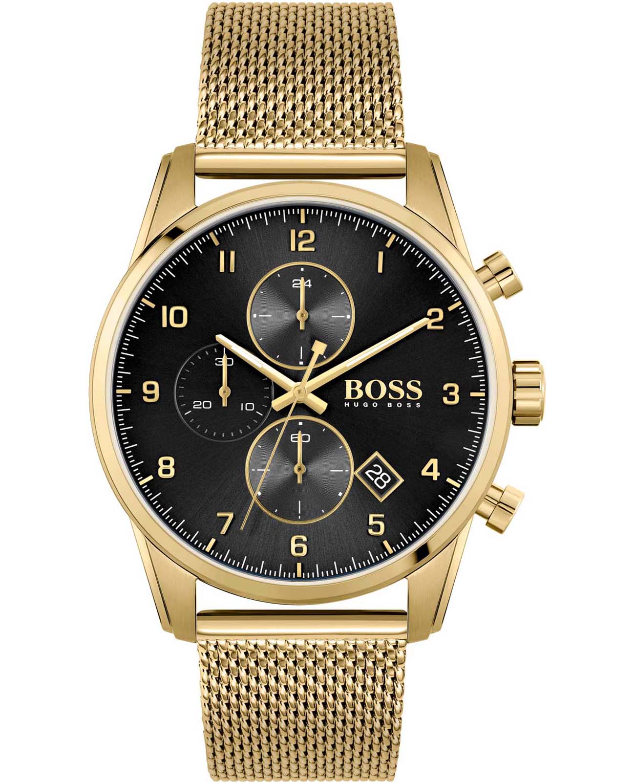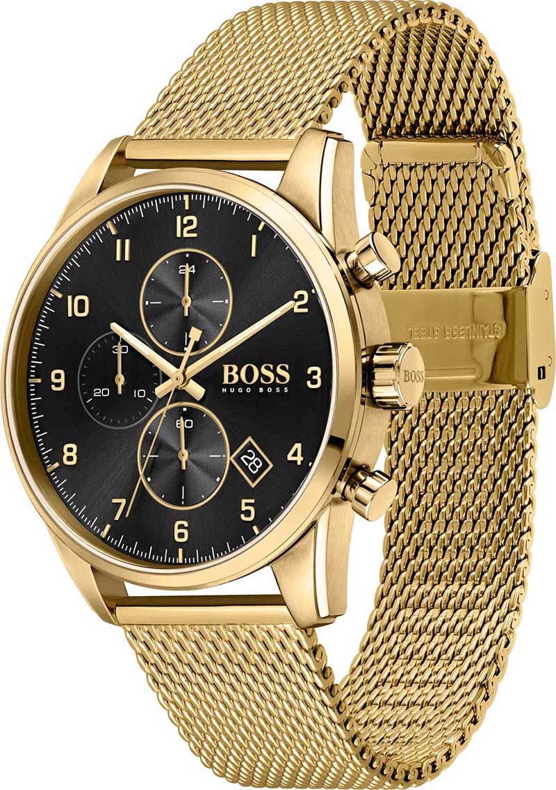 Мужские часы Hugo Boss Skymaster HB1513838 представлены в круглом 44-мм корпусе из нержавеющей стали 316L с золотистым IP-покрытиемIP-покрытиеМетод ионного напыления. Демонстрирует повышенную устойчивость к истиранию, окислению и химическим веществам. Под воздействием высокого давления и температуры около 1500°C молекулы металла надёжно соединяются с частицами корпуса часов. толщиной 10 мм. Оснащены кварцевым механизмом с функцией хронографаХронографФункция позволяет измерять отрезки времени с особой точностью: часы, минуты, секунды. Верным признаком хронографа является наличие на циферблате 3 дополнительных окошек-счётчиков. и секундомераСекундомерСекундоме́р — прибор, способный измерять интервалы времени с точностью до долей секунды.. Черный циферблат с арабскими цифрами защищен устойчивым к царапинам минеральным стекломМинеральное стеклоМинеральное стекло представляет собой искусственно выращенный минерал кварца. Такое стекло отличается особой устойчивостью к повреждениям и царапинам. Уступает по некоторым качествам сапфировому стеклу.. Стальной браслет с миланским плетением и с  IP-покрытиемIP-покрытиеМетод ионного напыления. Демонстрирует повышенную устойчивость к истиранию, окислению и химическим веществам. Под воздействием высокого давления и температуры около 1500°C молекулы металла надёжно соединяются с частицами корпуса часов. дополнен раскладной застёжкойРаскладная застёжкаТакой тип застёжки используется только на браслетах из металла. Она никогда не раскрывается полностью, происходит разделение на 2 и более частей. Раскладывающая застёжка снизит вероятность потери часов к минимуму.. Водонепроницаемость 50 метров (5 ATM) обеспечивает защиту от брызг воды.