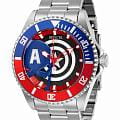 Мужские наручные часы Invicta IN29680 из коллекции Marvel Captain America сочетают в себе динамичный дизайн и надежность современных технологий . БезельБезельВнешний ободок, закрепляющий стекло. В спортивных часах так называется поворотное кольцо с делениями на циферблате, выполняет роль таймера – замеряет отрезки времени на шкале. Неподвижный безель – элемент декора. Однонаправленно вращающийся безель на дайверских часах позволяет фиксировать моменты погружения и выныривания на поверхность. с IP-покрытиемIP-покрытиеМетод ионного напыления. Демонстрирует повышенную устойчивость к истиранию, окислению и химическим веществам. Под воздействием высокого давления и температуры около 1500°C молекулы металла надёжно соединяются с частицами корпуса часов., что обеспечивает высокую устойчивость к внешним воздействиям . Браслет выполнен из нержавеющей стали оснащен раскладной застежкойРаскладная застёжкаТакой тип застёжки используется только на браслетах из металла. Она никогда не раскрывается полностью, происходит разделение на 2 и более частей. Раскладывающая застёжка снизит вероятность потери часов к минимуму., гарантирующей комфортное ношение и безопасность . Циферблат представлен в белом, синем и черном цветах, дополнен люминесцентными метками Tritnite, которые обеспечивают отличную видимость в темноте . Для защиты используется минеральное стеклоМинеральное стеклоМинеральное стекло представляет собой искусственно выращенный минерал кварца. Такое стекло отличается особой устойчивостью к повреждениям и царапинам. Уступает по некоторым качествам сапфировому стеклу., обеспечивающее прочную защиту от царапин . Часы работают на кварцевом механизме Seiko Hattori PC21J, что гарантирует точное время без необходимости подзаводки . Водонепроницаемость модели достигает 10 атмосфер (100 метров), что позволяет использовать их во время плавания и других водных видов спорта .