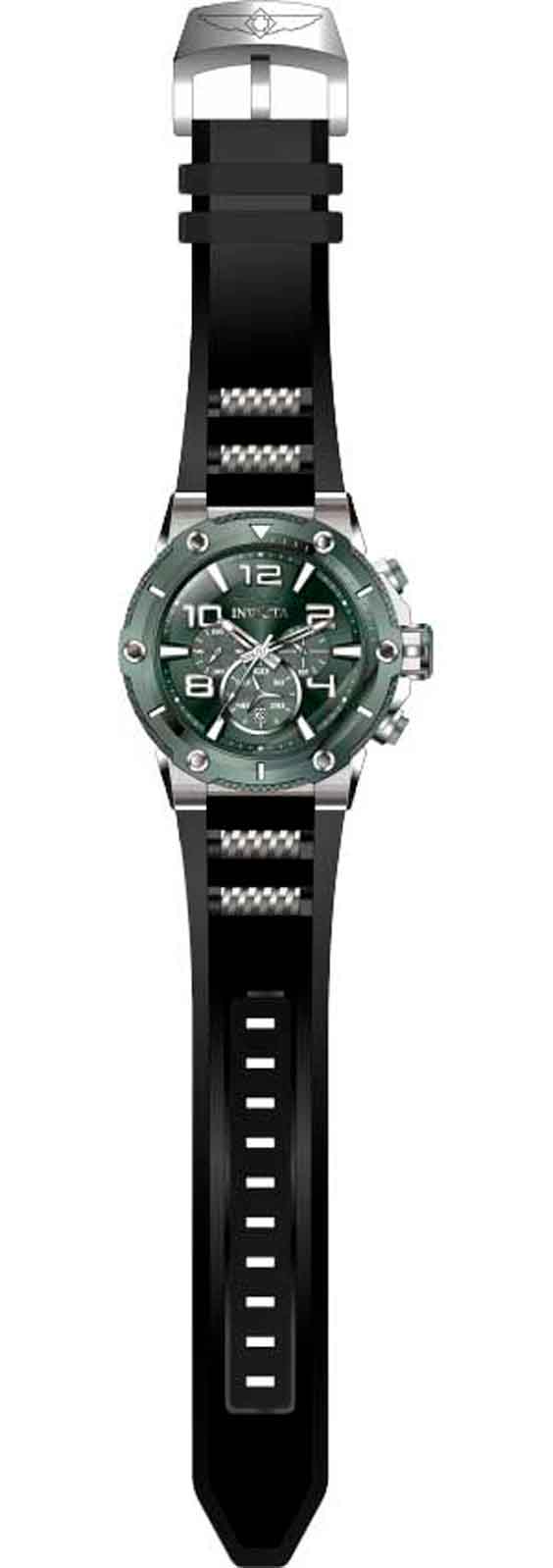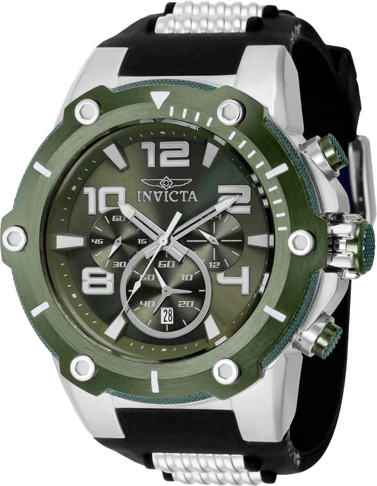 Мужские наручные часы-хронографХронографФункция позволяет измерять отрезки времени с особой точностью: часы, минуты, секунды. Верным признаком хронографа является наличие на циферблате 3 дополнительных окошек-счётчиков. Invicta IN40894 из коллекции Speedway сочетают в себе спортивный дизайн и надежность современных технологий. Модель обладает круглым корпусом, изготовленным из нержавеющей стали, что обеспечивает высокую устойчивость к внешним воздействиям . БезельБезельВнешний ободок, закрепляющий стекло. В спортивных часах так называется поворотное кольцо с делениями на циферблате, выполняет роль таймера – замеряет отрезки времени на шкале. Неподвижный безель – элемент декора. Однонаправленно вращающийся безель на дайверских часах позволяет фиксировать моменты погружения и выныривания на поверхность. с IP-покрытиемIP-покрытиеМетод ионного напыления. Демонстрирует повышенную устойчивость к истиранию, окислению и химическим веществам. Под воздействием высокого давления и температуры около 1500°C молекулы металла надёжно соединяются с частицами корпуса часов.. Ремешок оснащен классической застежкой, гарантирующей комфортное ношение и безопасность . Циферблат оснащен окном даты, расположенным в положении 6 часов, что делает их практичными для различных задач . Для защиты используется минеральное стеклоМинеральное стеклоМинеральное стекло представляет собой искусственно выращенный минерал кварца. Такое стекло отличается особой устойчивостью к повреждениям и царапинам. Уступает по некоторым качествам сапфировому стеклу., обеспечивающее прочную защиту от царапин . Часы работают на японском кварцевом механизме, что гарантирует точное время без необходимости подзаводки . Модель также является хронографомХронографФункция позволяет измерять отрезки времени с особой точностью: часы, минуты, секунды. Верным признаком хронографа является наличие на циферблате 3 дополнительных окошек-счётчиков., оснащенным функцией секундомераСекундомерСекундоме́р — прибор, способный измерять интервалы времени с точностью до долей секунды., что делает ее идеальной для активного образа жизни . Водонепроницаемость часов достигает 100 метров (10 атмосфер), что позволяет использовать их во время плавания и других водных видов спорта . Подсветка выполнена с использованием люминесцентного покрытияЛюминесцентное покрытиеПозволяет считывать показания времени в темноте. Производители наносят на стрелки, часовые индексы, безель или поверхность циферблата светонакопительный состав, дающий холодное свечение., что обеспечивает удобство использования в темное время суток .