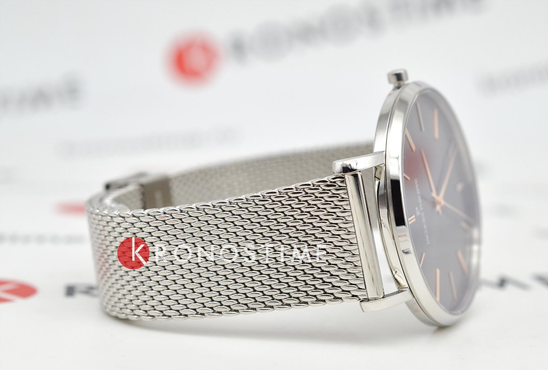 Ремешок выполнен из металлической миланской сетки, шириной 20 мм. Он гармонично сочетается с корпусом и обеспечивает лёгкую посадку, комфортную даже при длительном ношении. Водозащита до 3 ATM защищает часы от случайных брызг и дождя.