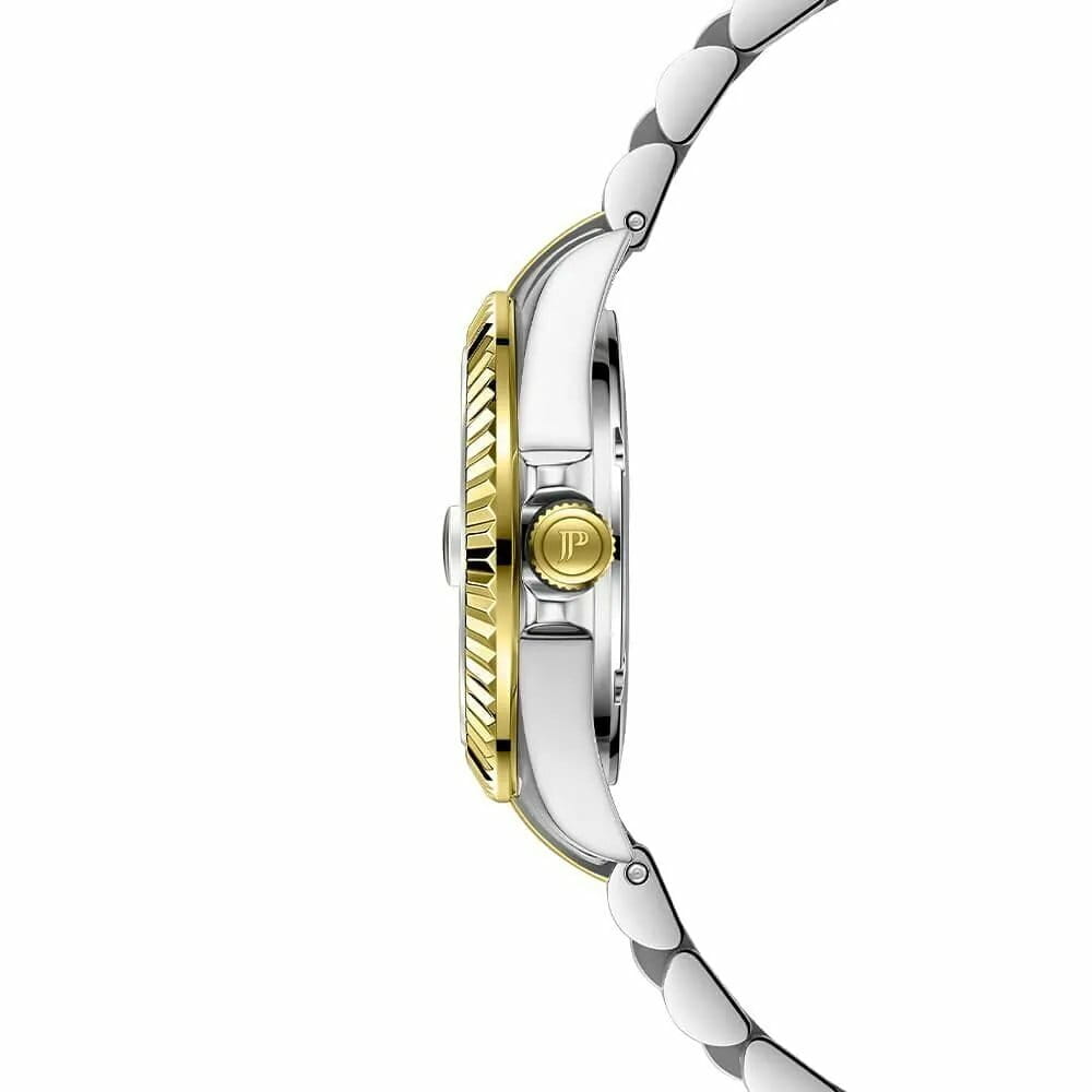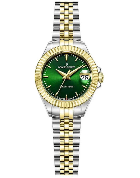 Jacques Philippe JPQLS8273X8 — женские часы в сдержанном классическом исполнении с акцентом на простоту и надёжность. Корпус диаметром 26 мм выполнен из нержавеющей стали — делает модель универсальной и комфортной в повседневной носке. Циферблат оформлен в светлом зеленом тоне с тонкими стрелками, лаконичными часовыми метками и аккуратным окошком даты в позиции «3 часа». Минималистичный стиль подчёркивает строгость и чистоту дизайна. Поверхность защищена устойчивым к царапинам сапфировым стекломСапфировое стеклоПрочный и надёжный материал из кристалла сапфира синтетического происхождения, характеризующийся особой твёрдостью и устойчивостью к царапинам и повреждениям., которое обеспечивает хорошую читаемость и долговечность. БезельБезельВнешний ободок, закрепляющий стекло. В спортивных часах так называется поворотное кольцо с делениями на циферблате, выполняет роль таймера – замеряет отрезки времени на шкале. Неподвижный безель – элемент декора. Однонаправленно вращающийся безель на дайверских часах позволяет фиксировать моменты погружения и выныривания на поверхность. с PVD-покрытиемPVDУльтратонкое покрытие наносится в технике вакуумного напыления, сочетает в себе нитрид титана особой прочности со слоем золота или оксида хрома. Несёт в себе декоративную или защитную функцию.. Механизм — точный швейцарский кварц, не требующий подзавода. Он обеспечивает стабильную и бесперебойную работу часов, сохраняя точность в любых условиях. Браслет из нержавеющей стали с PVD-покрытиемPVDУльтратонкое покрытие наносится в технике вакуумного напыления, сочетает в себе нитрид титана особой прочности со слоем золота или оксида хрома. Несёт в себе декоративную или защитную функцию. визуально продолжает корпус и фиксируется на застёжке-бабочке с кнопкамиЗастёжка "бабочка"Такой вид застёжки дополняется предохранителями, помогающими избежать случайного раскрытия браслета. Обладают изящным исполнением. , обеспечивая комфортную посадку. Водозащита до 10 ATM позволяет использовать часы не только в повседневной жизни, но и при активности на воде. Jacques Philippe — это надёжная и универсальная модель для тех, кто ценит швейцарскую точность, простоту и уверенный стиль без лишних деталей.