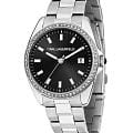Женские элегантные часы Karl Lagerfeld Round Essentials R0553101511, кварцевый механизм с высокой точностью. Минеральное стеклоМинеральное стеклоМинеральное стекло представляет собой искусственно выращенный минерал кварца. Такое стекло отличается особой устойчивостью к повреждениям и царапинам. Уступает по некоторым качествам сапфировому стеклу. устойчивое к появлению царапин, обладающее высокой прозрачностью. Изысканный корпус изготовлен из нержавеющей стали. Лаконичные центральные часовая, минутная и секундная стрелки. Водонепроницаемость 5 АТМ позволяет использовать часы в повседневных условиях — при мытье рук или под лёгким дождём. Стальной браслет c раскладной застёжкойРаскладная застёжкаТакой тип застёжки используется только на браслетах из металла. Она никогда не раскрывается полностью, происходит разделение на 2 и более частей. Раскладывающая застёжка снизит вероятность потери часов к минимуму., обеспечивающей комфорт и уверенную фиксацию на запястье, а также добавляя завершающий штрих к этому стильному аксессуару. Стрелки оснащены люминесцентным покрытиемЛюминесцентное покрытиеПозволяет считывать показания времени в темноте. Производители наносят на стрелки, часовые индексы, безель или поверхность циферблата светонакопительный состав, дающий холодное свечение., обеспечивающим хорошую читаемость в темноте. Циферблат и безельБезельВнешний ободок, закрепляющий стекло. В спортивных часах так называется поворотное кольцо с делениями на циферблате, выполняет роль таймера – замеряет отрезки времени на шкале. Неподвижный безель – элемент декора. Однонаправленно вращающийся безель на дайверских часах позволяет фиксировать моменты погружения и выныривания на поверхность. с кристаллами подчёркивают изысканный характер часов, создавая универсальный образ, подходящий как для повседневных ситуаций, так и для особых случаев. Аккуратное окошко даты на отметке «3 часов».