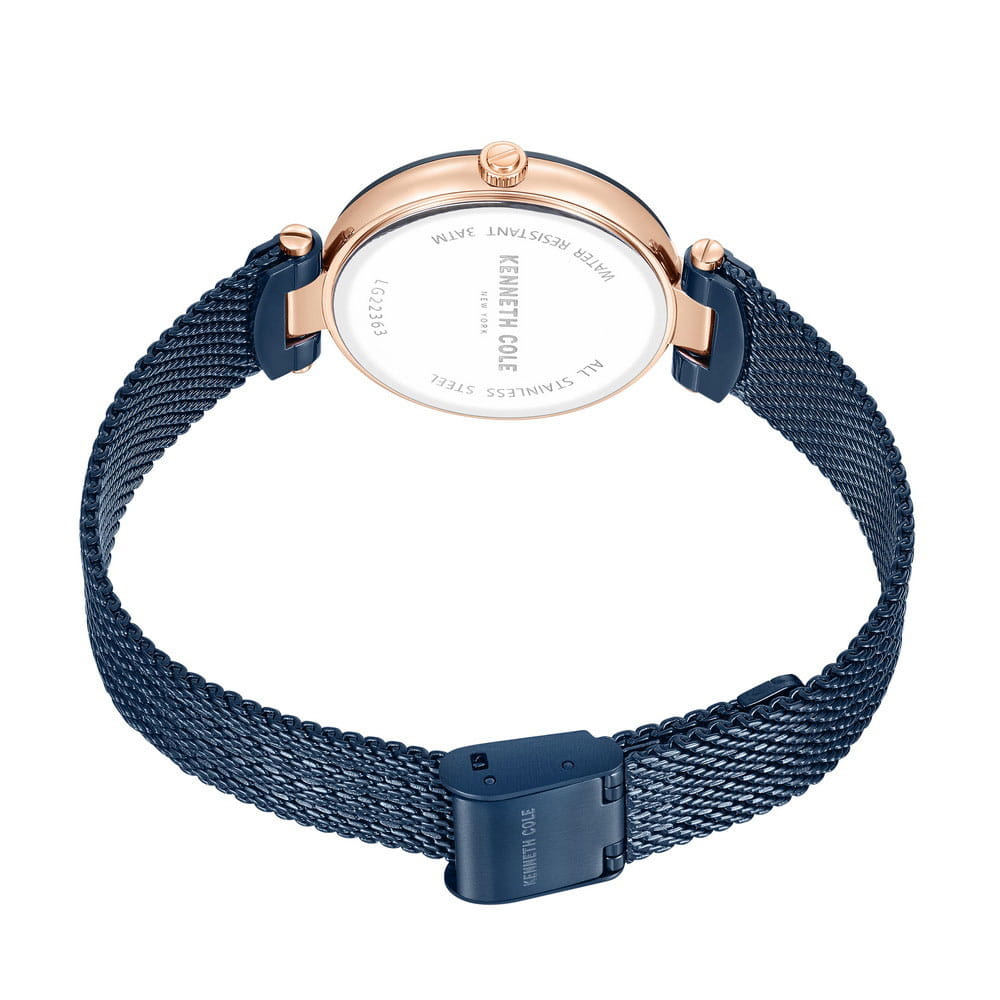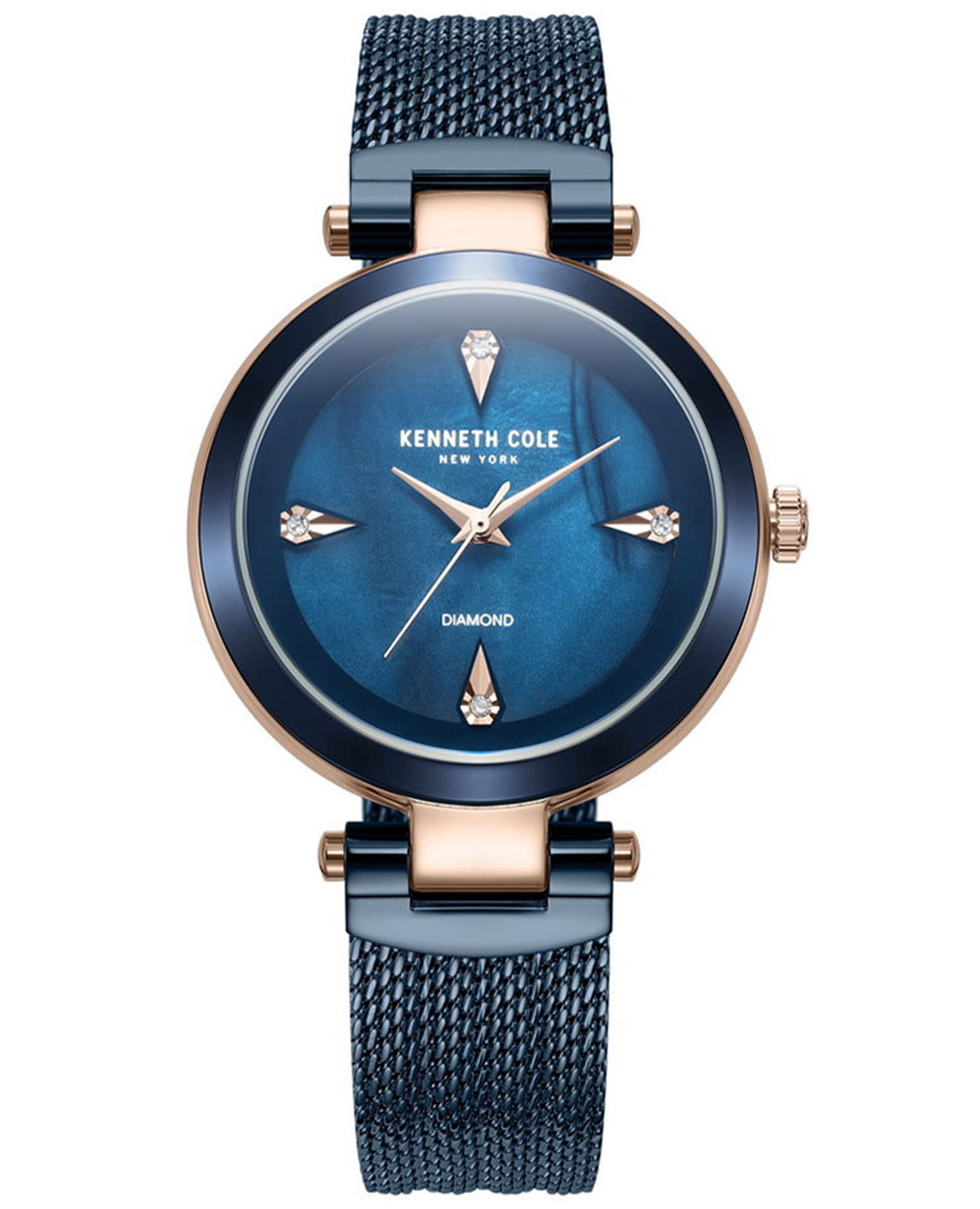 Женские кварцевые часы с минеральным стекломМинеральное стеклоМинеральное стекло представляет собой искусственно выращенный минерал кварца. Такое стекло отличается особой устойчивостью к повреждениям и царапинам. Уступает по некоторым качествам сапфировому стеклу. Kenneth Cole Classic KCWLG2236302, кварцевый механизм с высокой точностью. Класс водозащиты: 30 метров, позволит защитить корпус от случайных брызг или капель дождя. Корпус часов изготовлен из стали с IP-покрытиемIP-покрытиеМетод ионного напыления. Демонстрирует повышенную устойчивость к истиранию, окислению и химическим веществам. Под воздействием высокого давления и температуры около 1500°C молекулы металла надёжно соединяются с частицами корпуса часов.. Стальной браслет выполнен в технике миланского плетения на раскладной застёжкеРаскладная застёжкаТакой тип застёжки используется только на браслетах из металла. Она никогда не раскрывается полностью, происходит разделение на 2 и более частей. Раскладывающая застёжка снизит вероятность потери часов к минимуму. с IP-покрытиемIP-покрытиеМетод ионного напыления. Демонстрирует повышенную устойчивость к истиранию, окислению и химическим веществам. Под воздействием высокого давления и температуры около 1500°C молекулы металла надёжно соединяются с частицами корпуса часов.. БезельБезельВнешний ободок, закрепляющий стекло. В спортивных часах так называется поворотное кольцо с делениями на циферблате, выполняет роль таймера – замеряет отрезки времени на шкале. Неподвижный безель – элемент декора. Однонаправленно вращающийся безель на дайверских часах позволяет фиксировать моменты погружения и выныривания на поверхность. с IP-покрытиемIP-покрытиеМетод ионного напыления. Демонстрирует повышенную устойчивость к истиранию, окислению и химическим веществам. Под воздействием высокого давления и температуры около 1500°C молекулы металла надёжно соединяются с частицами корпуса часов.. Центральные часовая, минутная и секундная стрелки. Синий перламутровый циферблат украшен бриллиантами.