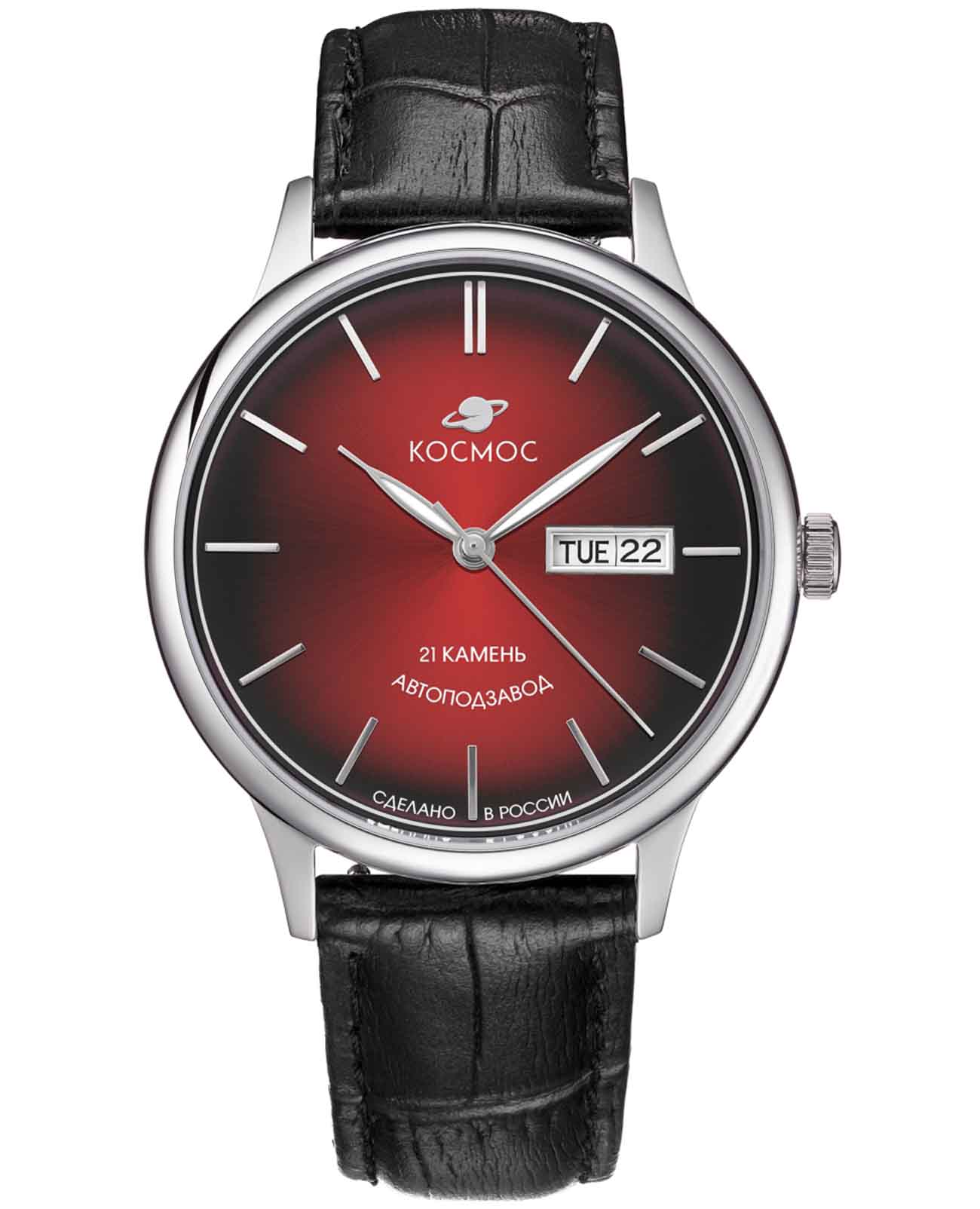 Российские мужские механические часы Космос K 043.11.35 с автоподзаводом оснащены корпусом из нержавеющей стали 316L диаметром 41 мм и защищены минеральным стекломМинеральное стеклоМинеральное стекло представляет собой искусственно выращенный минерал кварца. Такое стекло отличается особой устойчивостью к повреждениям и царапинам. Уступает по некоторым качествам сапфировому стеклу.. Красный циферблат дополнен функциями отображения даты и дня недели.Стрелки с люминесцентным покрытиемЛюминесцентное покрытиеПозволяет считывать показания времени в темноте. Производители наносят на стрелки, часовые индексы, безель или поверхность циферблата светонакопительный состав, дающий холодное свечение. обеспечивают хорошую видимость в темное время суток. Заводная головка декорирована логотипом бренда в виде стилизованного изображения планеты. Часы имеют водонепроницаемость 50 метров, позволит защитить корпус от случайных брызг или капель дождя. Модель комплектуется ремешком из натуральной кожи на стандартной застежке. Прочный корпус и надежный механизм делают эти часы универсальным аксессуаром для повседневного использования. Уникальный дизайн и высокое качество материалов подчеркивают индивидуальность владельца. Специальные крепежи позволяют легко заменить браслет на часах самостоятельно.