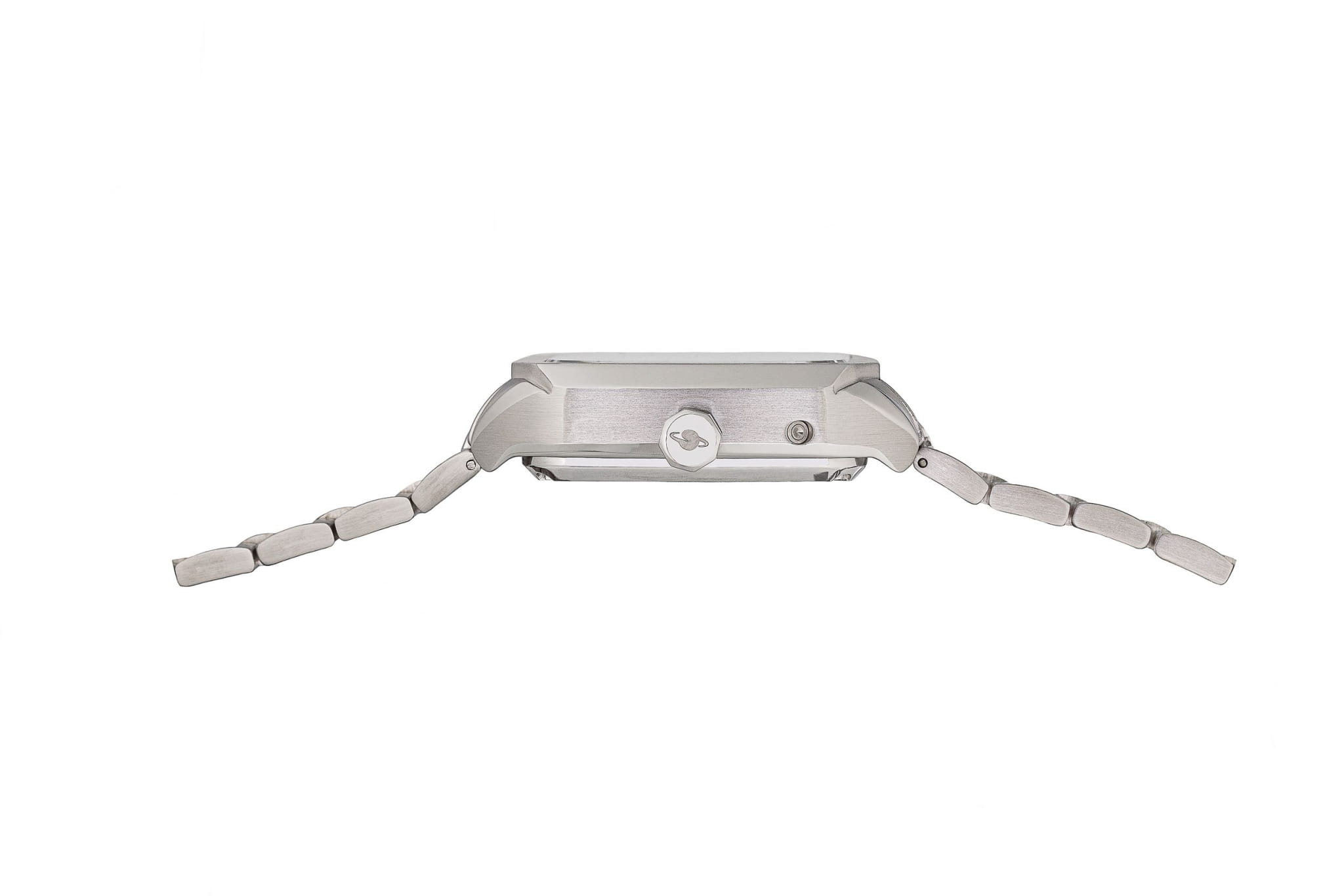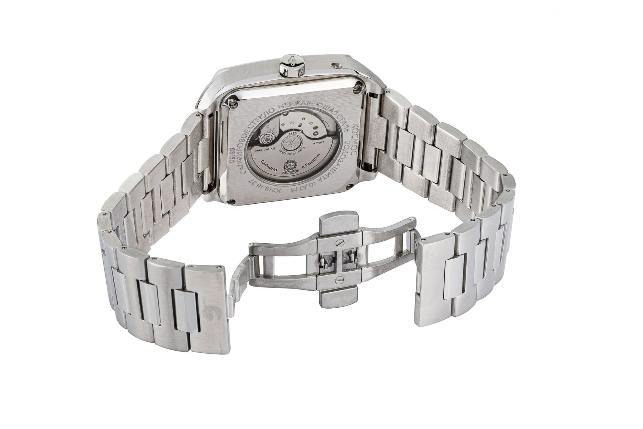 Мужские наручные часы Космос Марсоход II K 219.10.33 — это уникальная лимитированная серия, посвященная аппарату, способному передвигаться по поверхности Красной планеты. Марсоход ассоциируется с брутальностью, мастерством и технической сложностью. Наша страна дважды запускала подобные аппараты еще в 70-х годах прошлого века. Дизайн часов серии Марсоход вдохновлен лучшими работами советских мастеров, сочетая современные технологии часового искусства с обаянием стиля ретро. Корпус в форме квадрата с закругленными углами выполнен из нержавеющей стали украшенной зеркальной полировкой и сатинированием. Удобная заводная головка имеет форму гайки, что добавляет модели индустриальный шарм. Задняя крышка прозрачная, закрепленная на четырех винтах, и позволяет увидеть работу механизма TMI с подвижным ротором, на котором гравируется надпись «Сделано в России». Также здесь представлена гравировка с изображением космонавта, придающая часам особую значимость. Водостойкость достигает 10 атм (WR100), что позволяет использовать часы при плавании и других водных видах спорта. На задней крышке указан индивидуальный номер модели в формате от 01/50 до 50/50. Объемный циферблат состоит из двух уровней. В центре движутся три стрелки, часовая и минутная из которых имеют люминесцентное покрытиеЛюминесцентное покрытиеПозволяет считывать показания времени в темноте. Производители наносят на стрелки, часовые индексы, безель или поверхность циферблата светонакопительный состав, дающий холодное свечение., позволяющее определять время даже в темноте. Также, здесь расположили три дополнительных индикатора: день недели, месяц и время в формате 24-х часов. Для обозначения дня недели и месяца используется кириллица. Окошко даты между 4 и 5 часами выделено накладной рамкой. Циферблат защищен прочным сапфировым стеклом с антибликовым покрытиемСапфировое стеклоПрочный и надёжный материал из кристалла сапфира синтетического происхождения, характеризующийся особой твёрдостью и устойчивостью к царапинам и повреждениям., обеспечивающим отличную читаемость показаний в любых условиях. Второй уровень декорирован гильоше в виде солнечных лучей, на нем закреплены накладные индексы. Браслет изготовлен из литых стальных звеньев нержавеющей стали и оснащен удобной застёжкой «бабочка» с кнопкамиЗастёжка "бабочка"Такой вид застёжки дополняется предохранителями, помогающими избежать случайного раскрытия браслета. Обладают изящным исполнением. , которая сводит к минимуму вероятность потери. Заводная головка, застежка и браслет украшены фирменным логотипом бренда. Коллекция Марсоход — идеальный выбор для ценителей истории космических достижений и современных технологий.