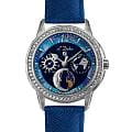 Женские кварцевые часы L'Duchen из коллекции Celeste — это изысканный аксессуар, сочетающий швейцарское качество и элегантный дизайн. Корпус круглой формы выполнен из стали и защищён сапфировым стекломСапфировое стеклоПрочный и надёжный материал из кристалла сапфира синтетического происхождения, характеризующийся особой твёрдостью и устойчивостью к царапинам и повреждениям.. Циферблат синего цвета украшен перламутровым кольцом по краю, придающим модели уникальность и благородное сияние. Центральная часть оформлена волнообразным гильоше, индикатор дня недели представлен в виде солнечного диска, а даты — изображением карты Земли. Указатель выделен металлической рамкой и дополнен объёмным элементом в виде месяца. Широкий полированный безельБезельВнешний ободок, закрепляющий стекло. В спортивных часах так называется поворотное кольцо с делениями на циферблате, выполняет роль таймера – замеряет отрезки времени на шкале. Неподвижный безель – элемент декора. Однонаправленно вращающийся безель на дайверских часах позволяет фиксировать моменты погружения и выныривания на поверхность. инкрустирован фианитами, эффектно переливающимися на свету. Часы оснащены ремешком из натуральной кожи синего цвета с сафьяновым тиснением и застёжкой «бабочка» с кнопкамиЗастёжка "бабочка"Такой вид застёжки дополняется предохранителями, помогающими избежать случайного раскрытия браслета. Обладают изящным исполнением. , украшенной логотипом бренда. Водонепроницаемость 50 м позволяет использовать часы в повседневных условиях, защищая от случайных брызг и капель дождя.