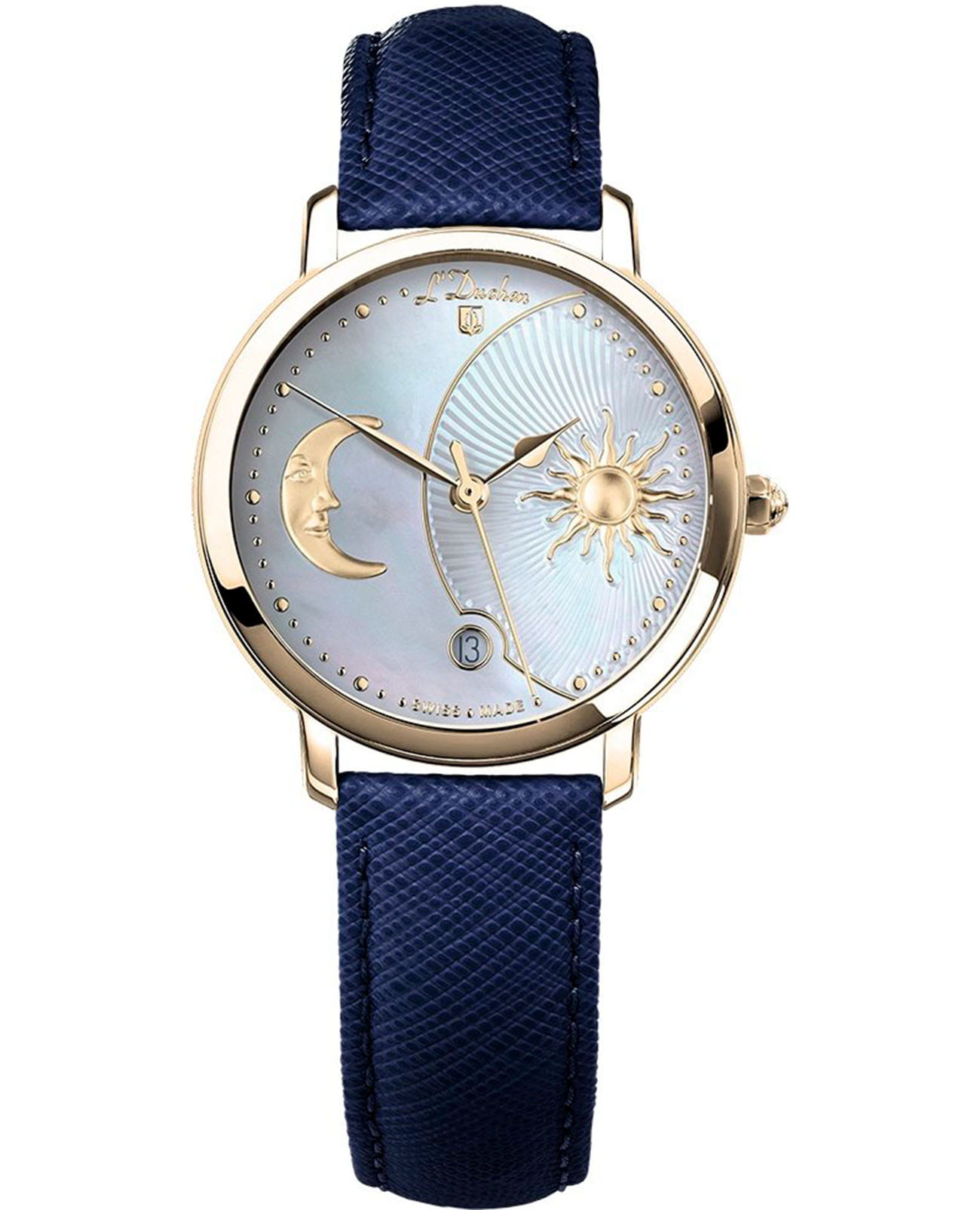 Женские кварцевые часы L'Duchen из коллекции Day & Night — это изысканный аксессуар, вдохновлённый сменой времени суток. Корпус диаметром 34 мм выполнен из нержавеющей стали с PVD-покрытиемPVDУльтратонкое покрытие наносится в технике вакуумного напыления, сочетает в себе нитрид титана особой прочности со слоем золота или оксида хрома. Несёт в себе декоративную или защитную функцию. жёлтого золота. Циферблат белого цвета изготовлен из натурального перламутра и условно разделён на две части: одна символизирует день с объёмным солнцем и декором в виде гильоше, другая — ночь с объёмным изображением луны. Окошко даты расположено в положении 6 часов. Циферблат защищён сапфировым стекломСапфировое стеклоПрочный и надёжный материал из кристалла сапфира синтетического происхождения, характеризующийся особой твёрдостью и устойчивостью к царапинам и повреждениям.. Часы оснащены ремешком из натуральной кожи синего цвета с сафьяновым тиснением и застёжкой «бабочка» с кнопкамиЗастёжка "бабочка"Такой вид застёжки дополняется предохранителями, помогающими избежать случайного раскрытия браслета. Обладают изящным исполнением. , украшенной логотипом бренда — дубовым листом, символом мудрости и долговечности. Заводная головка — восьмигранной формы. Водонепроницаемость 50 м позволяет использовать часы в повседневных условиях.