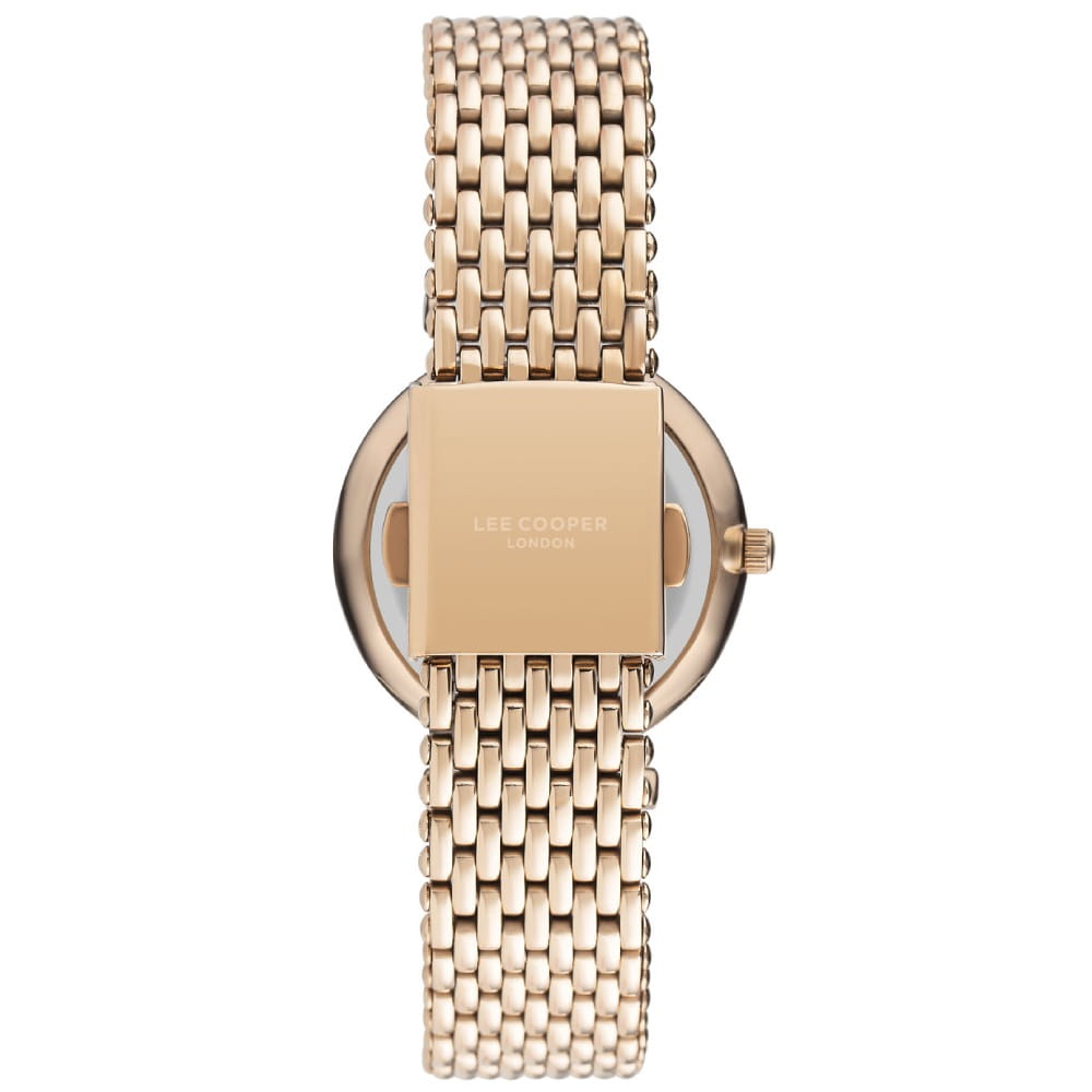 Женские наручные часы Lee Cooper LC07410.130 — это элегантная модель с утончённым дизайном. Корпус диаметром 33 мм выполнен из нержавеющей стали с IP-покрытиемIP-покрытиеМетод ионного напыления. Демонстрирует повышенную устойчивость к истиранию, окислению и химическим веществам. Под воздействием высокого давления и температуры около 1500°C молекулы металла надёжно соединяются с частицами корпуса часов., что придаёт часам изысканный вид. Перламутровый циферблат украшен изящными метками из кристаллов и стрелками, обеспечивая удобное считывание времени. Циферблат защищён минеральным стекломМинеральное стеклоМинеральное стекло представляет собой искусственно выращенный минерал кварца. Такое стекло отличается особой устойчивостью к повреждениям и царапинам. Уступает по некоторым качествам сапфировому стеклу., устойчивым к царапинам. Часы работают на кварцевом механизме, обеспечивая точность хода. Браслет из нержавеющей стали с раскладной застёжкойРаскладная застёжкаТакой тип застёжки используется только на браслетах из металла. Она никогда не раскрывается полностью, происходит разделение на 2 и более частей. Раскладывающая застёжка снизит вероятность потери часов к минимуму. гарантирует комфортное ношение и надёжную фиксацию на запястье. Водозащита 30 метров защищает часы от случайных брызг и дождя, делая их подходящими для повседневного использования.