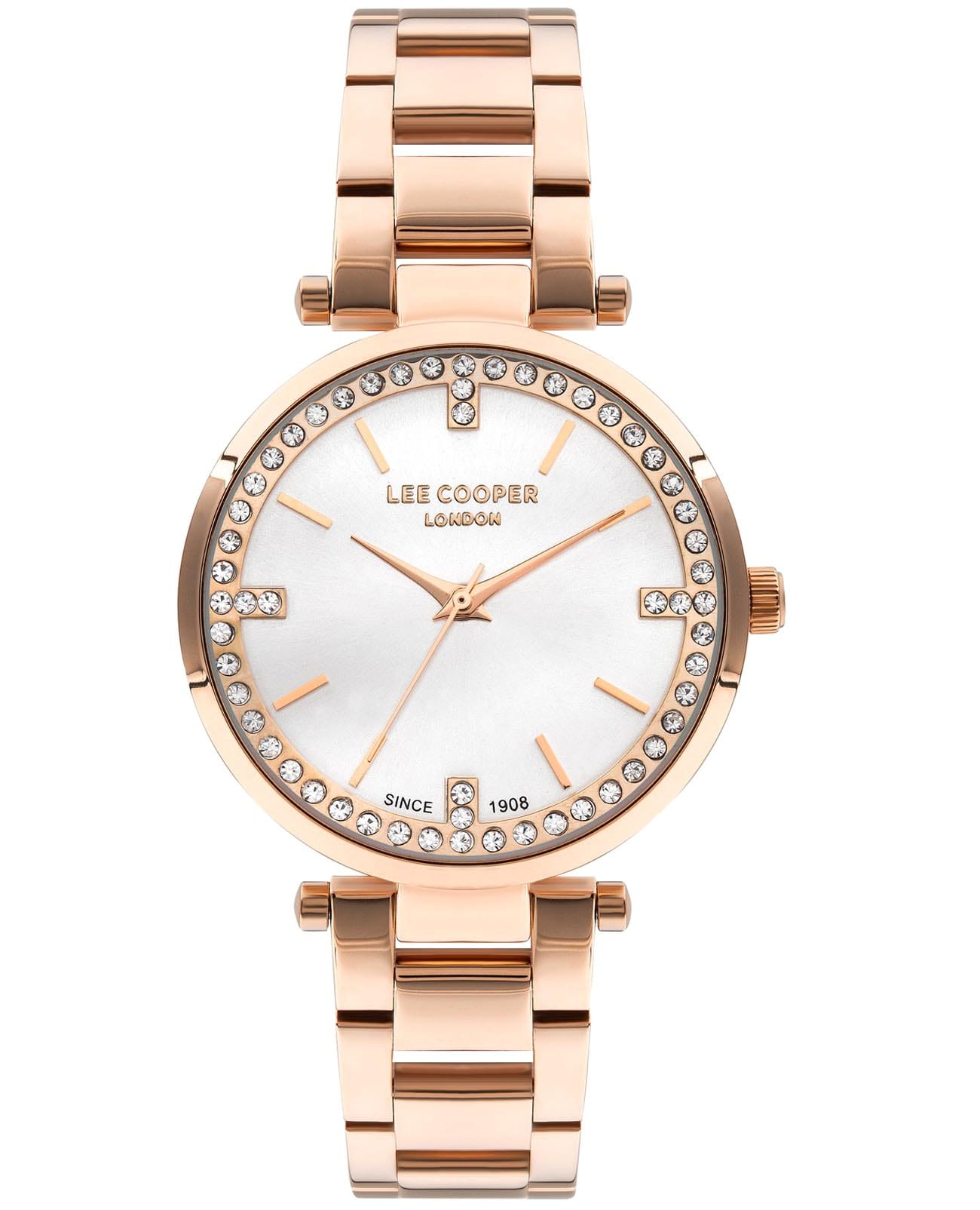 Женские часы Lee Cooper LC07591.430 — это стильное сочетание элегантности и современного дизайна. Круглый корпус диаметром 33 мм выполнен из суперметалла с IP-покрытиемIP-покрытиеМетод ионного напыления. Демонстрирует повышенную устойчивость к истиранию, окислению и химическим веществам. Под воздействием высокого давления и температуры около 1500°C молекулы металла надёжно соединяются с частицами корпуса часов. цвета розового золота. Серебристый циферблат инкрустирован цирконами, что придает модели особый блеск и защищен минеральным стекломМинеральное стеклоМинеральное стекло представляет собой искусственно выращенный минерал кварца. Такое стекло отличается особой устойчивостью к повреждениям и царапинам. Уступает по некоторым качествам сапфировому стеклу., обеспечивающим устойчивость к царапинам. Центральные часовая, минутная и секундная стрелки. Часы оснащены надежным кварцевым механизмом, источник питания - батарейка. Металлический браслет с IP-покрытиемIP-покрытиеМетод ионного напыления. Демонстрирует повышенную устойчивость к истиранию, окислению и химическим веществам. Под воздействием высокого давления и температуры около 1500°C молекулы металла надёжно соединяются с частицами корпуса часов. на раскладной застёжкеРаскладная застёжкаТакой тип застёжки используется только на браслетах из металла. Она никогда не раскрывается полностью, происходит разделение на 2 и более частей. Раскладывающая застёжка снизит вероятность потери часов к минимуму. гарантирует комфортную посадку на запястье. Водозащита 30 метров защищает модель от случайных брызг и дождя. Lee Cooper — отличный выбор для тех, кто ценит утонченность и качество.
