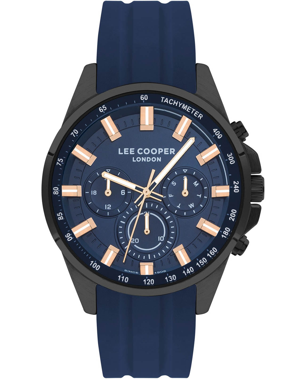 Lee Cooper LC07635.499  — элегантная модель с функциональными возможностями для повседневного использования. Корпус из суперметалла  с IP-покрытиемIP-покрытиеМетод ионного напыления. Демонстрирует повышенную устойчивость к истиранию, окислению и химическим веществам. Под воздействием высокого давления и температуры около 1500°C молекулы металла надёжно соединяются с частицами корпуса часов. и диаметром 46 мм придаёт часам классический и современный вид. Циферблат защищён минеральным стекломМинеральное стеклоМинеральное стекло представляет собой искусственно выращенный минерал кварца. Такое стекло отличается особой устойчивостью к повреждениям и царапинам. Уступает по некоторым качествам сапфировому стеклу., устойчивым к царапинам, хорошо может выдержать небольшие удары и падения. Стильный циферблат оформлен изысканными индексами и дополнен окошками даты, дня недели и 24-часового индикатора, а также аккуратными метками и стрелками с люминесцентным покрытиемЛюминесцентное покрытиеПозволяет считывать показания времени в темноте. Производители наносят на стрелки, часовые индексы, безель или поверхность циферблата светонакопительный состав, дающий холодное свечение., что гарантирует читаемость даже в условиях недостаточного освещения. Функция второго часового поясаВторой часовой поясФункция, позволяющая отображать время двух часовых поясов одновременно. делает часы удобными для путешественников. Часы работают на кварцевом механизме, обеспечивающем точность хода. Каучуковый ремешок на стандартной застёжке гарантирует удобную посадку и надёжную фиксацию на запястье. Водозащита 50 метров защищает часы от брызг и дождя, делая их подходящими для повседневного использования.