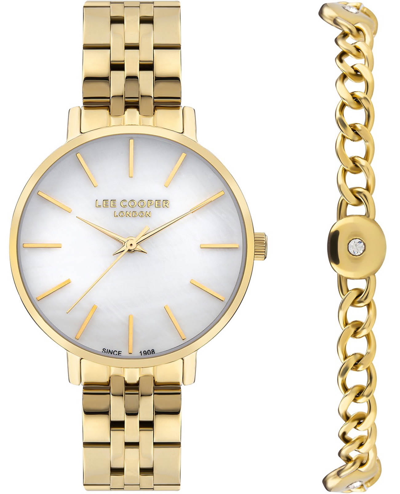 Женские часы Lee Cooper LC07857.120 — это стильное сочетание элегантности и современного дизайна. Изящный круглый корпус диаметром 34 мм выполнен из суперметалла с IP-покрытиемIP-покрытиеМетод ионного напыления. Демонстрирует повышенную устойчивость к истиранию, окислению и химическим веществам. Под воздействием высокого давления и температуры около 1500°C молекулы металла надёжно соединяются с частицами корпуса часов. золотого цвета, что придает модели особый блеск. Перламутровый циферблат защищен минеральным стекломМинеральное стеклоМинеральное стекло представляет собой искусственно выращенный минерал кварца. Такое стекло отличается особой устойчивостью к повреждениям и царапинам. Уступает по некоторым качествам сапфировому стеклу., обеспечивающим устойчивость к царапинам. Метки в виде штрихов. Часы оснащены надежным кварцевым механизмом, а стальной браслет с IP-покрытиемIP-покрытиеМетод ионного напыления. Демонстрирует повышенную устойчивость к истиранию, окислению и химическим веществам. Под воздействием высокого давления и температуры около 1500°C молекулы металла надёжно соединяются с частицами корпуса часов. на раскладной застёжкеРаскладная застёжкаТакой тип застёжки используется только на браслетах из металла. Она никогда не раскрывается полностью, происходит разделение на 2 и более частей. Раскладывающая застёжка снизит вероятность потери часов к минимуму. гарантирует комфортную посадку на запястье. Водозащита 30 метров защищает модель от случайных брызг и дождя. В комплекте к часам идет дополнительный браслет в цвет часов. Lee Cooper  — отличный выбор для тех, кто ценит утонченность и качество.