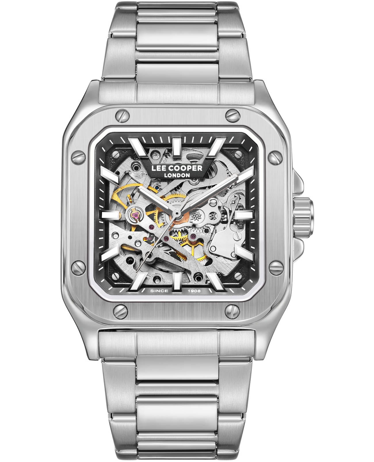 Мужские наручные часы-скелетоны Lee Cooper LC08198.350 механические с автоподзаводом, обеспечивающие высокую точность хода и надежность. Корпус часов выполнен из суперметалла серебристого цвета, размером 39 мм X 48 мм, что делает их устойчивыми к внешним воздействиям и придает благородный вид. Циферблат украшен классическими стрелками и метками с люминесцентным покрытиемЛюминесцентное покрытиеПозволяет считывать показания времени в темноте. Производители наносят на стрелки, часовые индексы, безель или поверхность циферблата светонакопительный состав, дающий холодное свечение., гармонично дополняющим общий дизайн модели. Для защиты циферблата используется минеральное стеклоМинеральное стеклоМинеральное стекло представляет собой искусственно выращенный минерал кварца. Такое стекло отличается особой устойчивостью к повреждениям и царапинам. Уступает по некоторым качествам сапфировому стеклу., устойчивое к царапинам и механическим повреждениям. Браслет из стали оснащен раскладной застёжкойРаскладная застёжкаТакой тип застёжки используется только на браслетах из металла. Она никогда не раскрывается полностью, происходит разделение на 2 и более частей. Раскладывающая застёжка снизит вероятность потери часов к минимуму., обеспечивающим комфортное и безопасное ношение. Часы обладают водонепроницаемостью до 50 метров (5 АТМ), что позволяет использовать их в повседневной жизни, включая контакт с водой при мытье рук или дожде. Эти часы станут идеальным выбором для мужчин, ценящих стиль, качество и функциональность.